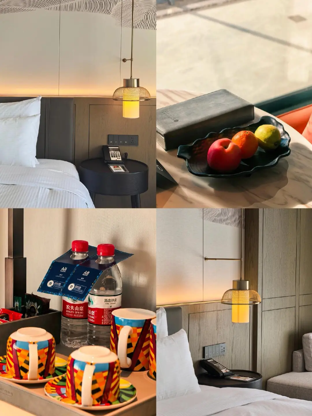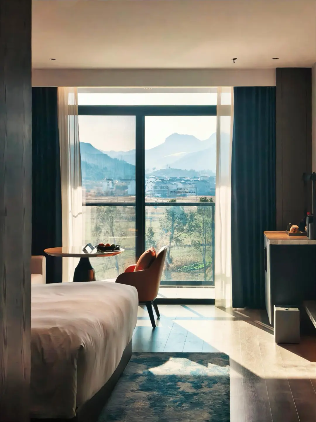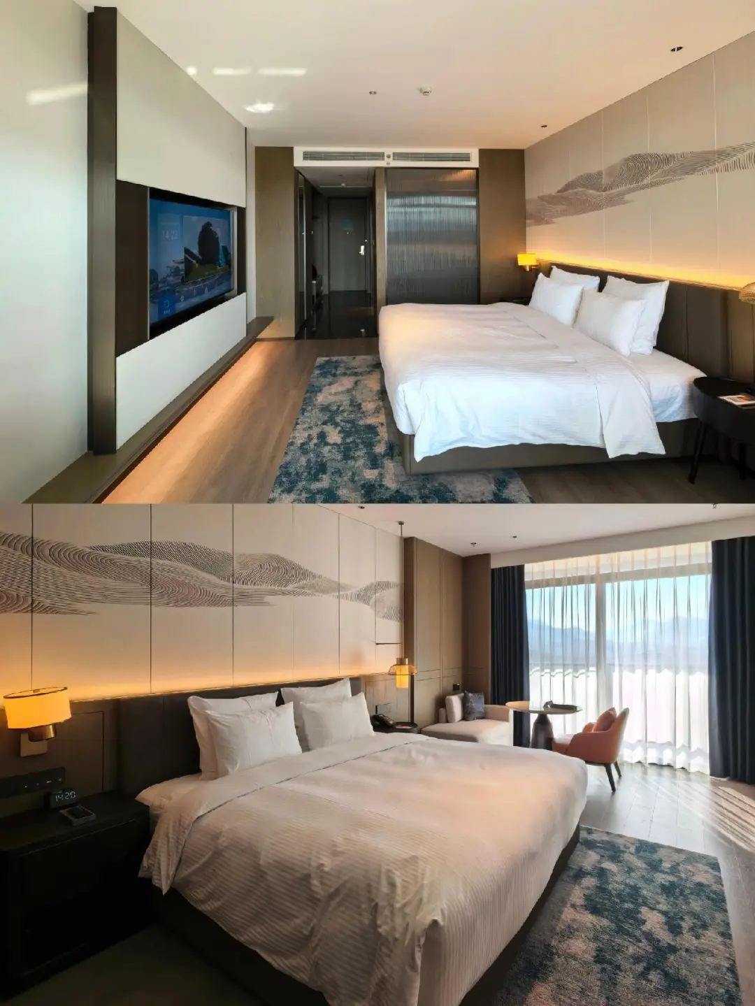 酒店地理位置很好,离神仙居游客中心只有几百米,坐景区摆渡车就可以到很方便。大堂的银杏吊灯设计感十足,扇形月洞门下午四点的光影绝了。入住前台识别会员升级到豪华行政景观大床房。