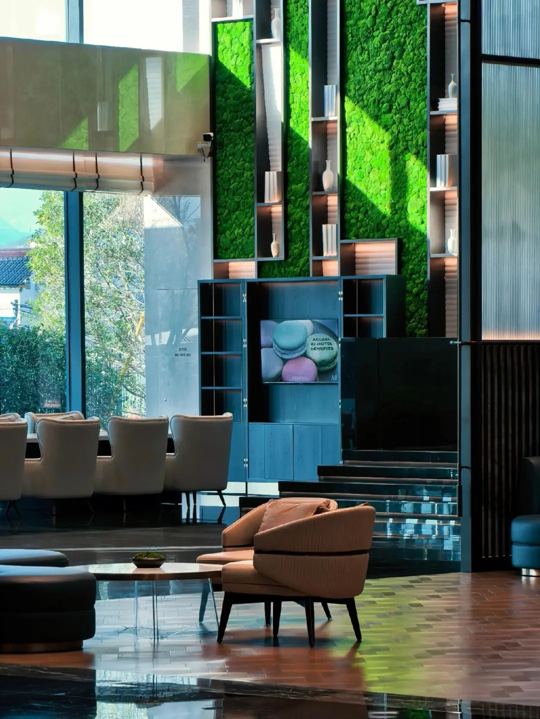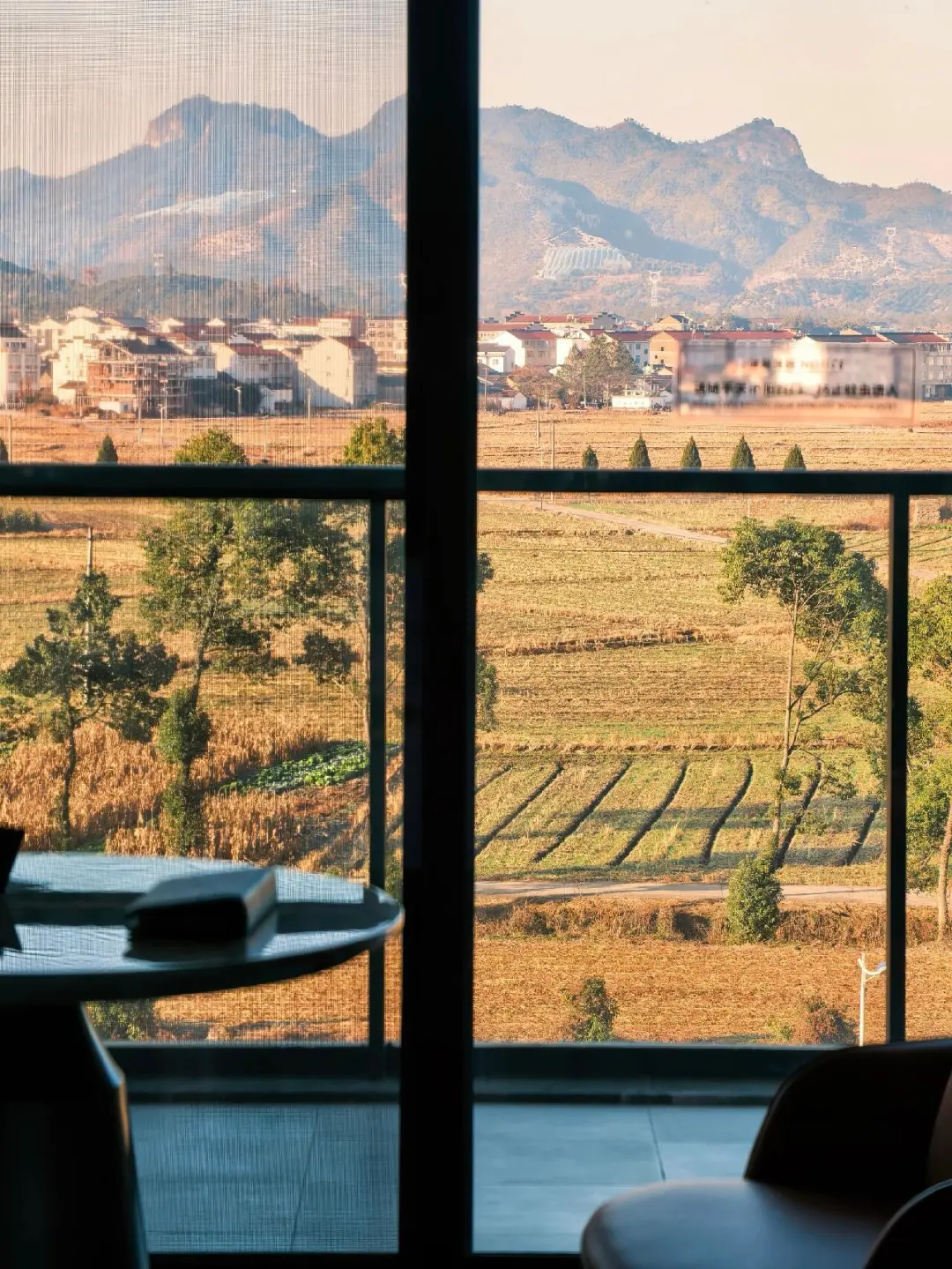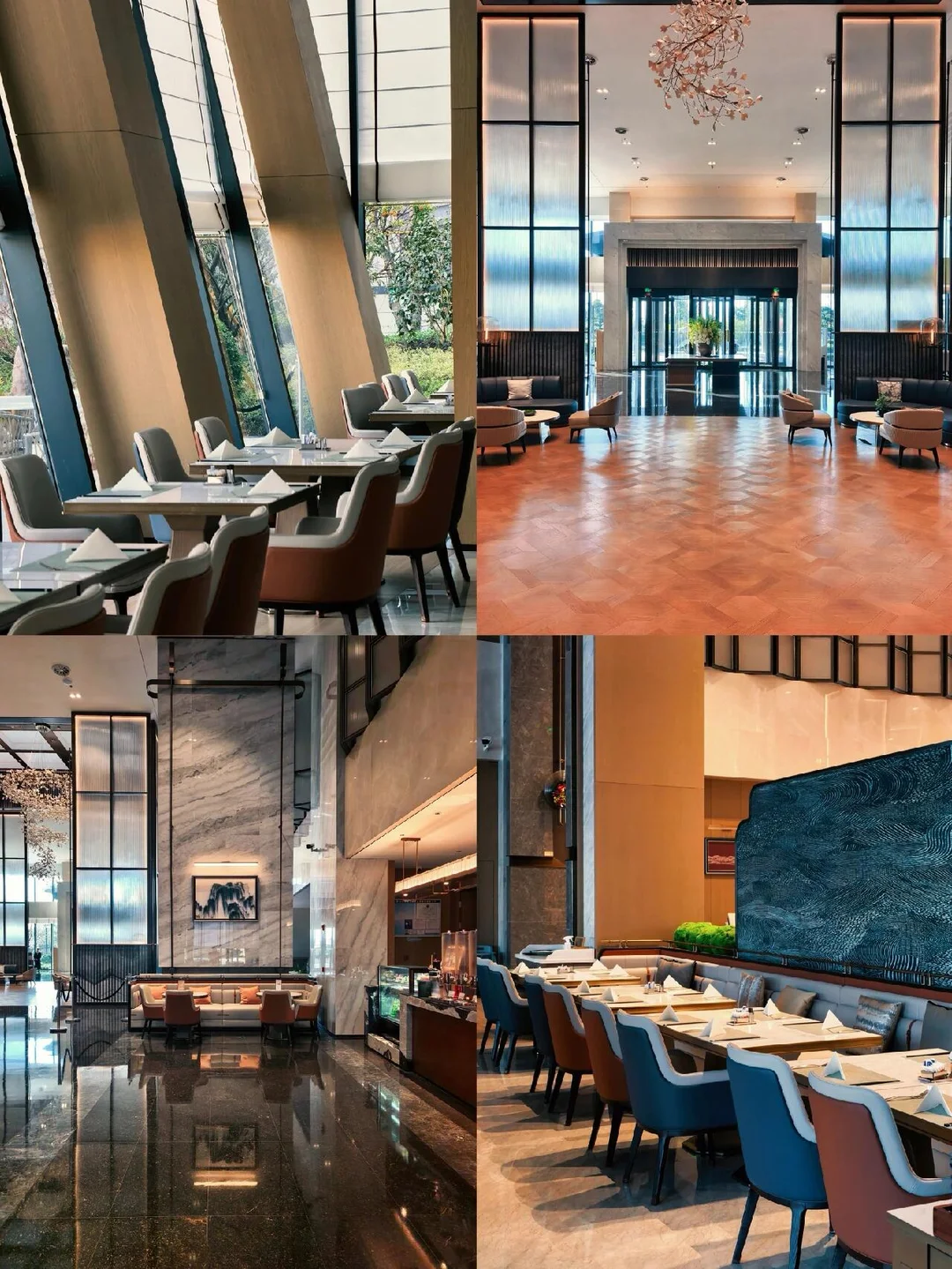 酒店地理位置很好,离神仙居游客中心只有几百米,坐景区摆渡车就可以到很方便。大堂的银杏吊灯设计感十足,扇形月洞门下午四点的光影绝了。入住前台识别会员升级到豪华行政景观大床房。