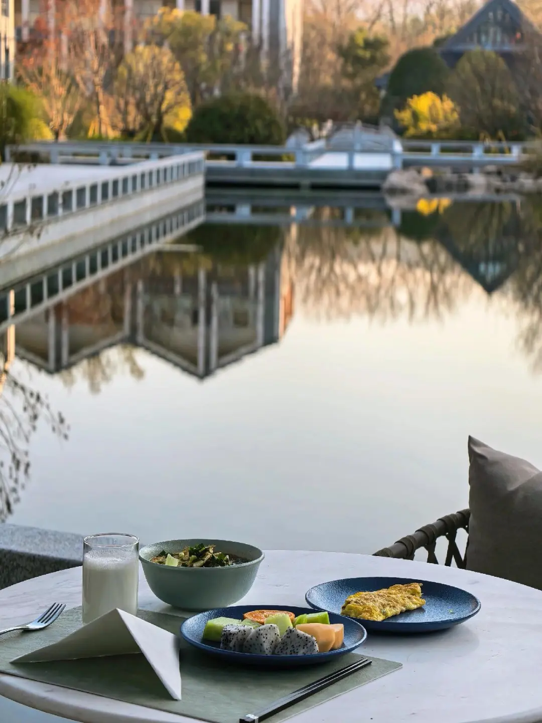 酒店本身就是个宝藏景点,白墙黛瓦的合围式江南院落,中间围着湖水拱桥,锦鲤在水里游来游去,随便找个角落都能拍出古风大片,酒店还送了古风旅拍📸 。