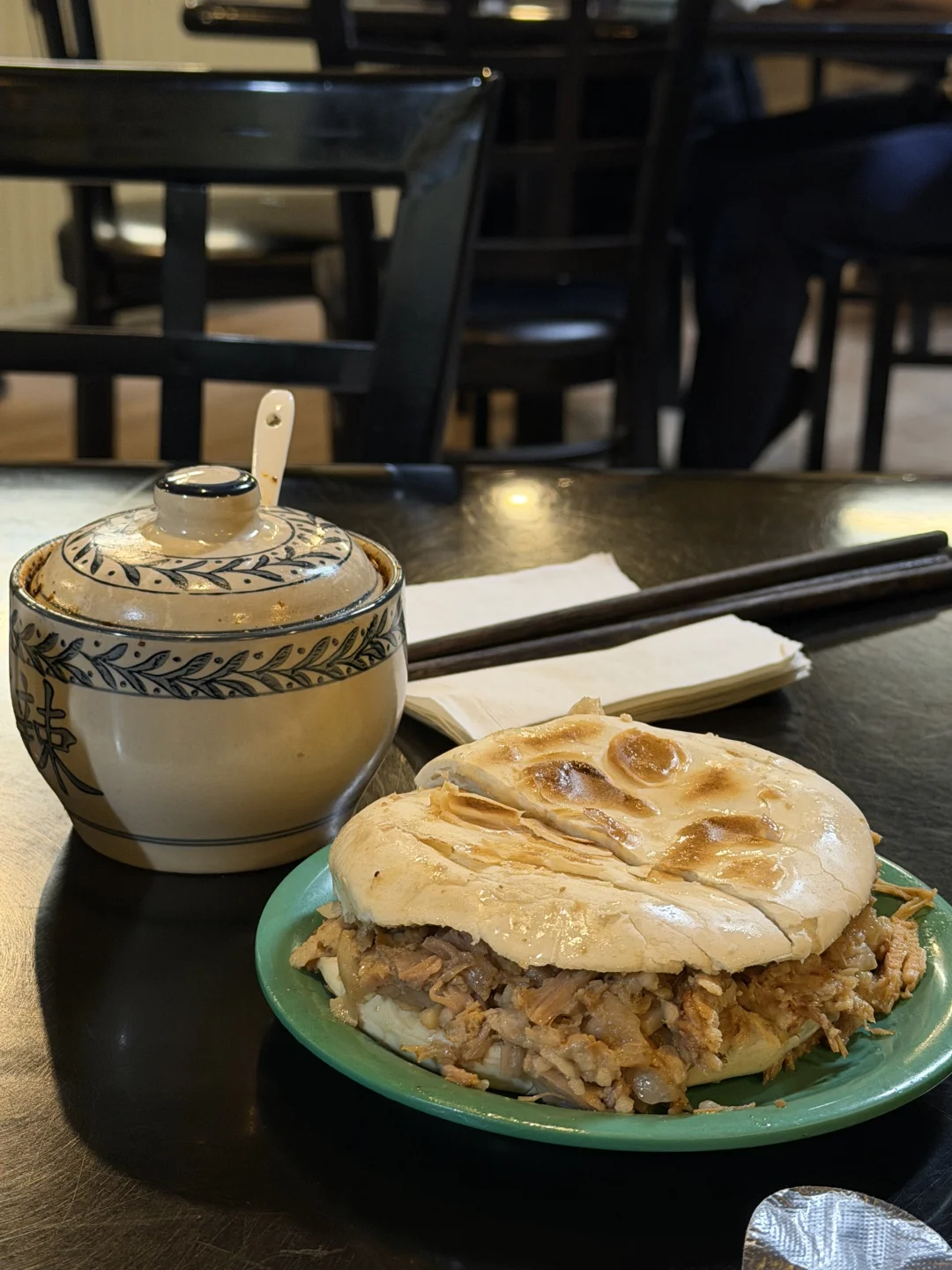 走了一段时间了,也不知道下次啥时候会去,已经开始想念牛逼的油泼面,牛逼的肉夹馍,牛逼的甑糕,牛逼的油辣子——在纽约费城都不太能找到对手吧?!肉夹馍量大油润,白馍口感正好;油泼面巨香,选什么臊子都不会错;岐山臊子面是推荐款,很正宗;第一次吃甑糕,甜粽子馅儿的口感,俩人分一份作为餐后甜点刚合适。只是有点气自己,没搞几瓶他家单卖的油辣子回家。