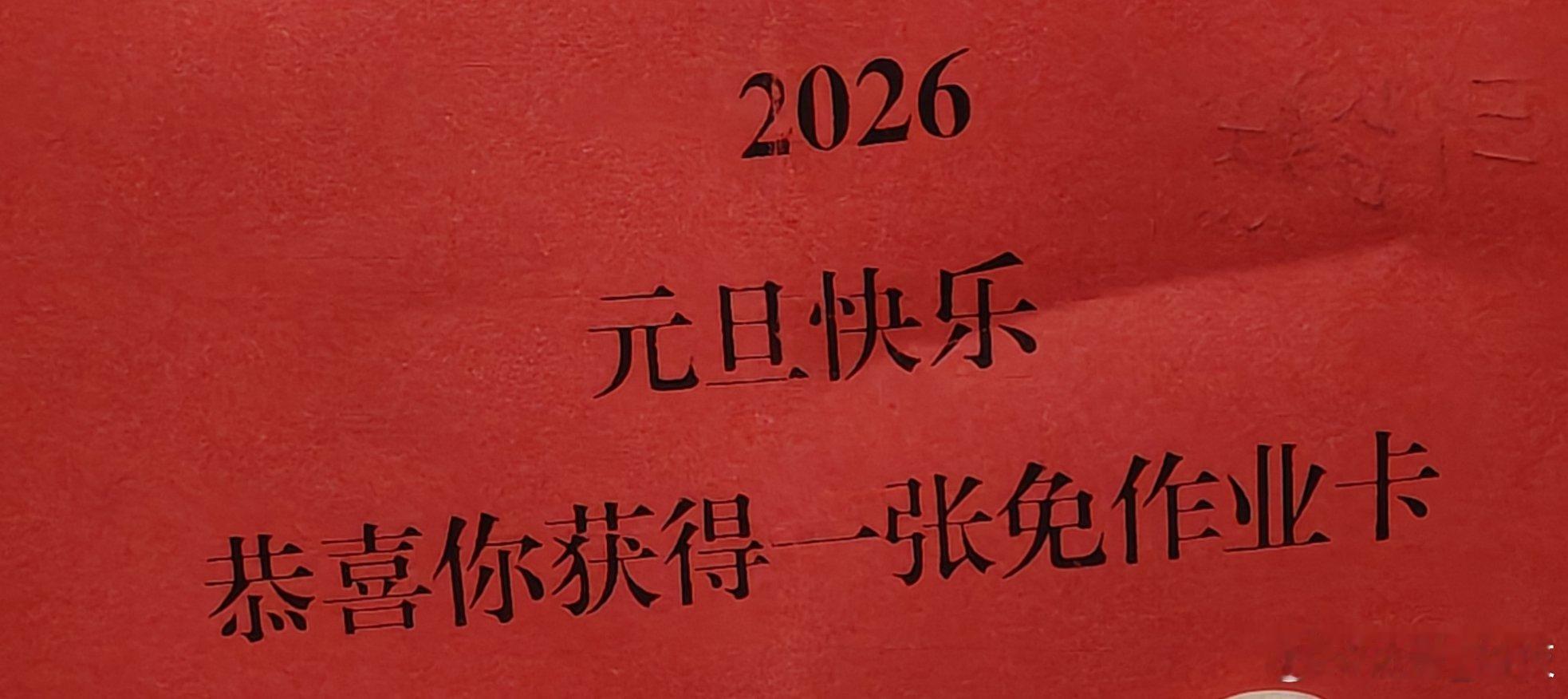 告别2025 我姑娘今天放学太高兴了,学校组织的抽红包迎喜庆活动,抽到了“一张免作业卡”。这个假期可以好好玩了,不过我姑娘说作业还是会写。2026给新年添喜力