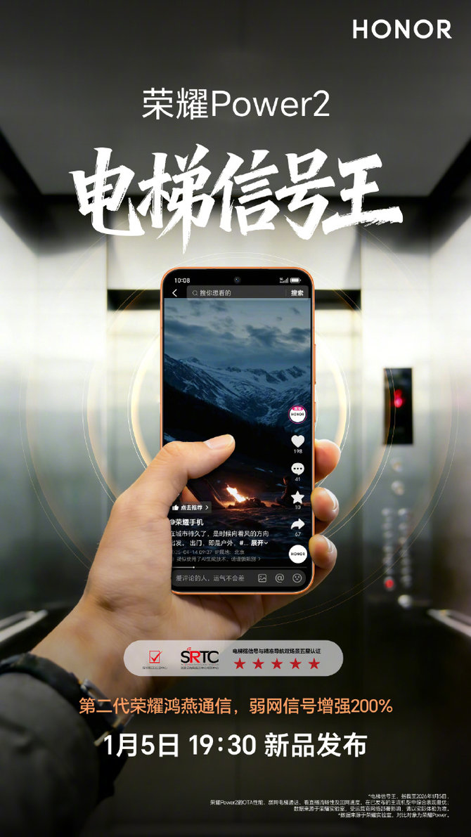 通信方面同样诚意拉满,荣耀Power2搭载旗舰同款的鸿燕六翼天线系统,配合荣耀自研射频增强芯片C1+以及多源融合定位引擎,构建起全场景优质通信网络。更值得一提的是,凭借卓越的通信能力,荣耀Power2已荣获国家无线电监测中心检测中心颁发的电梯强信号与精准导航双场景五星认证,这一权威认证意味着在电梯、地下车库等传统信号薄弱区域,用户也能享受稳定的信号连接与精准的导航服务,彻底解决中端机用户的通信焦虑。