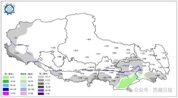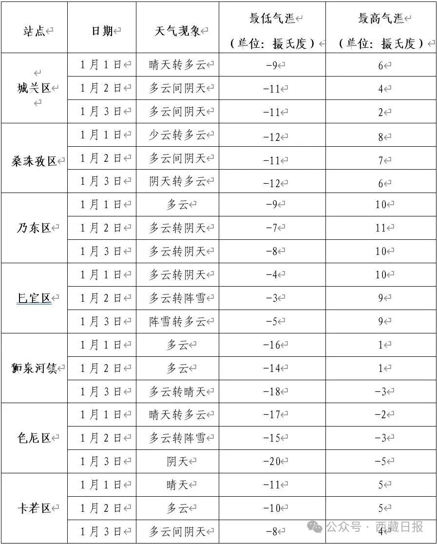 降水预报:预计1月1日,林芝、山南南部和阿里南部有小雪(雨),部分地方中雪;日喀则南部、拉萨、那曲东部、昌都北部和阿里西部多云,部分地方阴天有阵雪;其他地方少云间多云。1月2日至3日,林芝、那曲东部和山南南部有小到中雪(雨),部分高海拔地方有大雪;阿里南部、日喀则南部、昌都北部、拉萨东部和北部阴天有阵雪,部分高海拔地方有小到中雪;其他地方多云。
