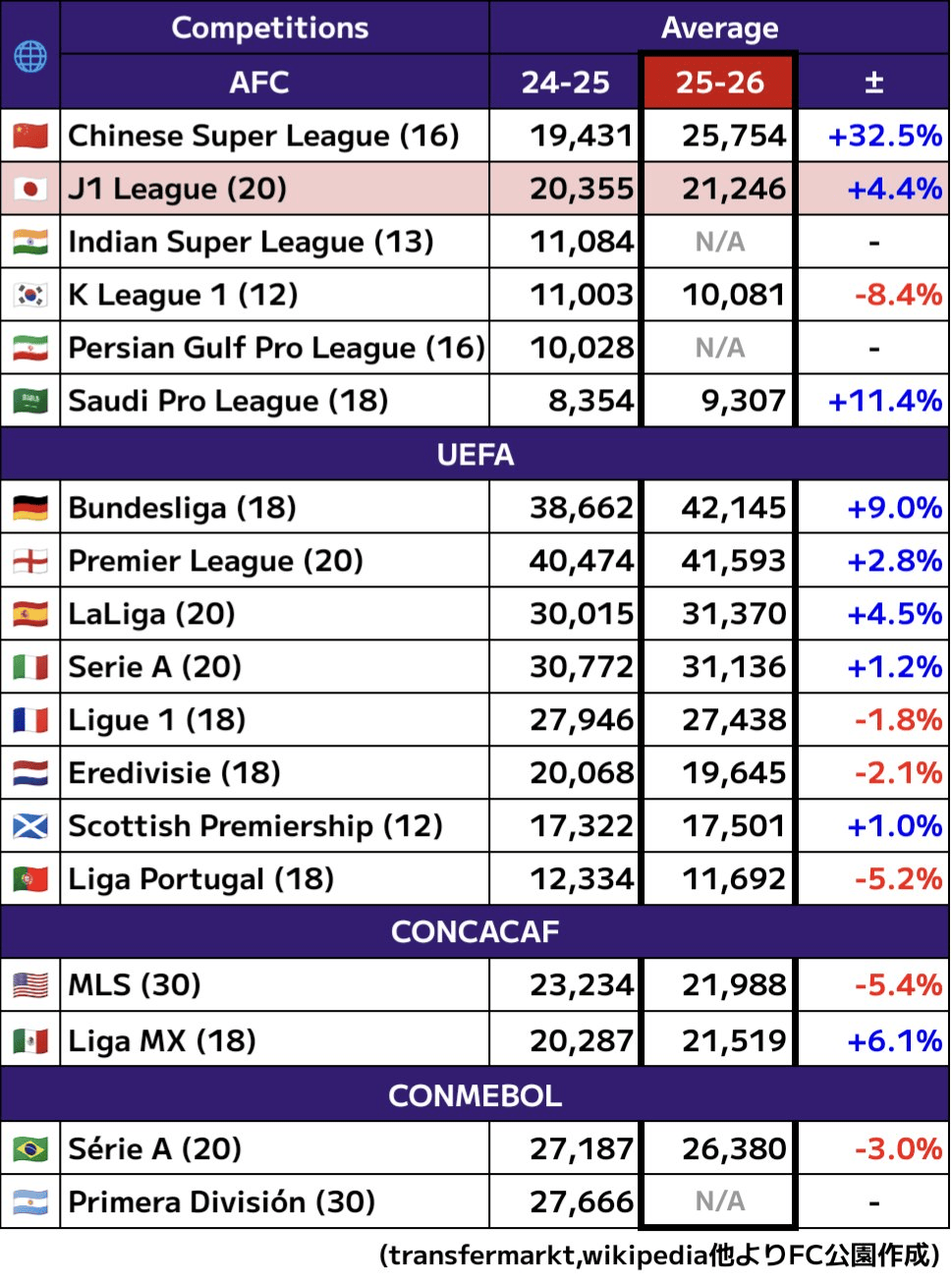 同时该博主还统计了亚洲、欧洲、美洲主要联赛的上座情况。中超和J1呈现增幅,而K1联赛则继续下行。