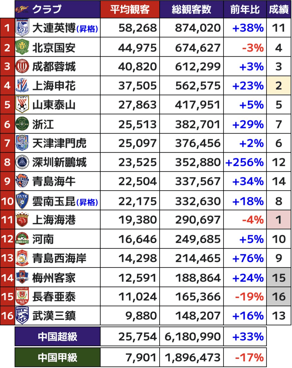 2025赛季中超联赛平均入场观众数为25754人,相比较2024赛季上涨了33%。其中中超升班马大连英博以场均58268人位列中超榜首,相比2024年的中甲赛季增幅为38%。而深圳新鹏城则是增幅最大,相比较2024赛季上涨了256%,场均23525人。而中超联赛本赛季只有北京国安、上海海港和长春亚泰三支队伍的场均上座人数是比2024赛季要少的。