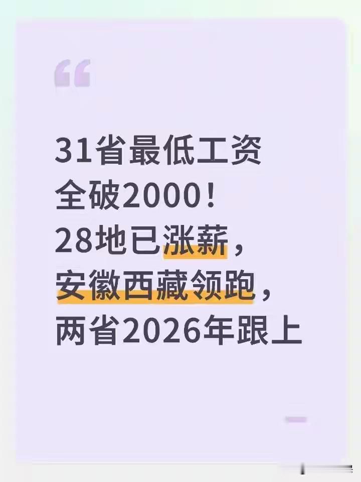 今年28地涨工资,安徽西藏涨得最多 今年28个城市涨工资,这个消息像一股暖流,瞬间点燃了无数人的希望与期待。尤其是安徽、西藏这些地方,涨幅之大令人惊叹,仿佛在告诉我们:只要努力,生活的天花板也可以被打破。这不仅仅是数字的变化,更是一种信号——中国的经济在悄然发生着变化,普通人也能迎来属于自己的春天。 但你是否也在心底问过自己:为什么有的城市工资涨得快,有的却平平淡淡?背后藏着什么样的故事?有人说,这是政策的倾斜,是地区发展的差异;有人觉得,是企业的转型升级在带动工资增长;还有人暗暗期待,这是不是一个信号——我们也能赶上那波“涨工资”的浪潮? 其实,这个问题的答案远比表面复杂。它折射出的是一个社会的深层次变革——从“拼速度”到“拼质量”,从“单纯追求增长”到“注重民生改善”。而更令人振奋的是,工资的上涨,不仅仅是数字的变动,更是一份对未来的承诺——只要你敢梦想,敢努力,就有可能迎来属于自己的“涨工资”时刻。 然而,现实中也不乏疑问:涨了工资,生活就一定变好吗?我们是否能用更高的工资,换来更好的生活品质?答案或许因人而异,但有一点可以确定——每一次的“涨工资”,都是社会向公平、向希望迈出的一步。它告诉我们,努力的价值不会被埋没,梦想的种子在这片土地上依然可以生根发芽。 这次的“涨工资”潮,或许是一个新的起点。它激励我们不要满足于现状,不要被眼前的困难击倒。因为,只有不断向前,才能迎来更宽广的天空。每个人都值得拥有更好的未来,每个人都可以在这股浪潮中找到属于自己的位置。 所以,亲爱的读者,你准备好迎接这场变革了吗?也许下一次的工资调整,就会成为你人生转折的起点。让我们一起期待,也一起努力,用行动去迎接那个更美好的明天。毕竟,生活从来都不是等来的,而是靠我们用心去争取的。涨工资 涨工资政策