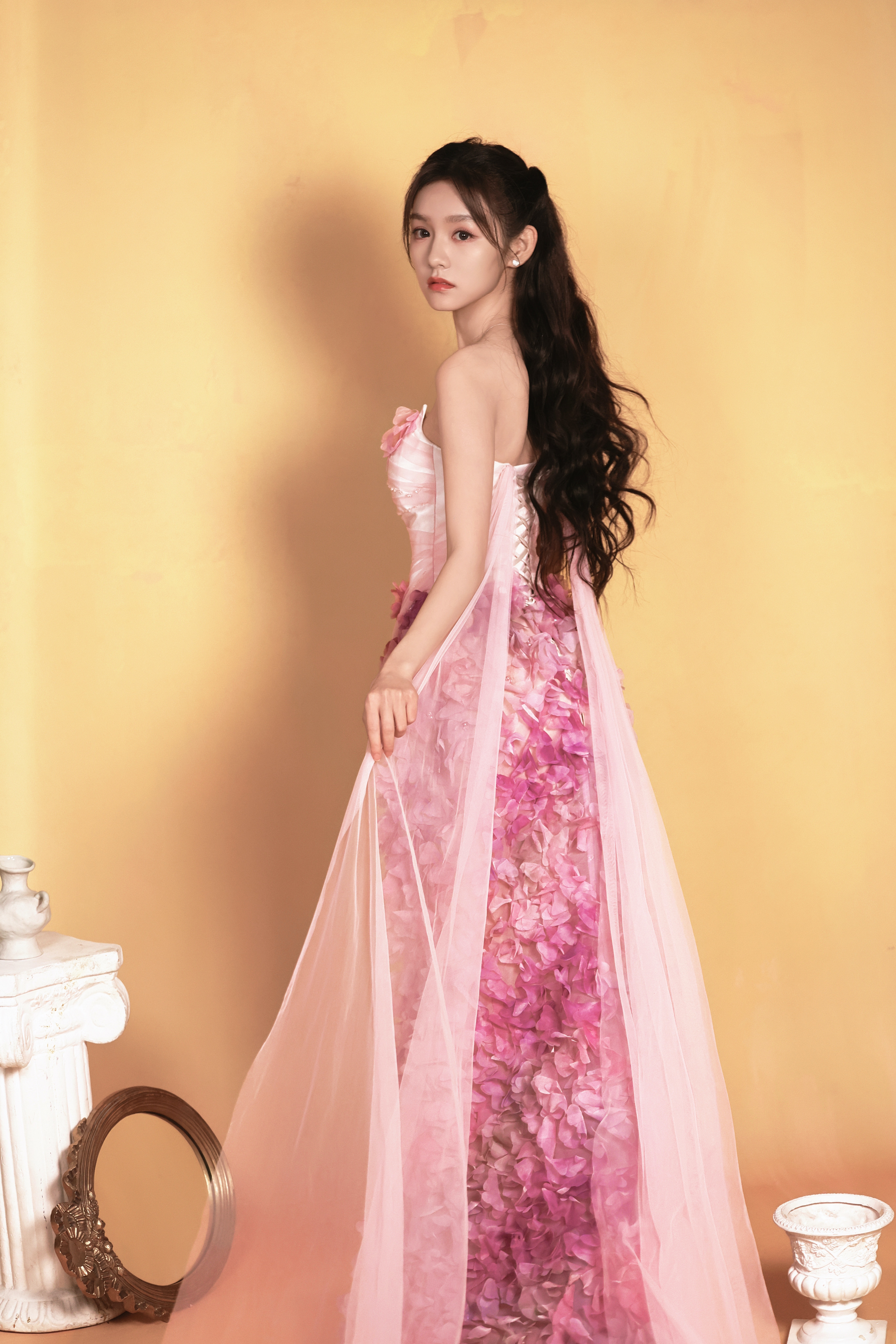 贺美琦把花海穿在身上了 远远看去,就像一朵会走动的粉色云霞,近了才发觉那是缀满花朵的裙摆。她手捧花束的样子,温柔又灵动,仿佛随时会随着花香轻轻飞起来