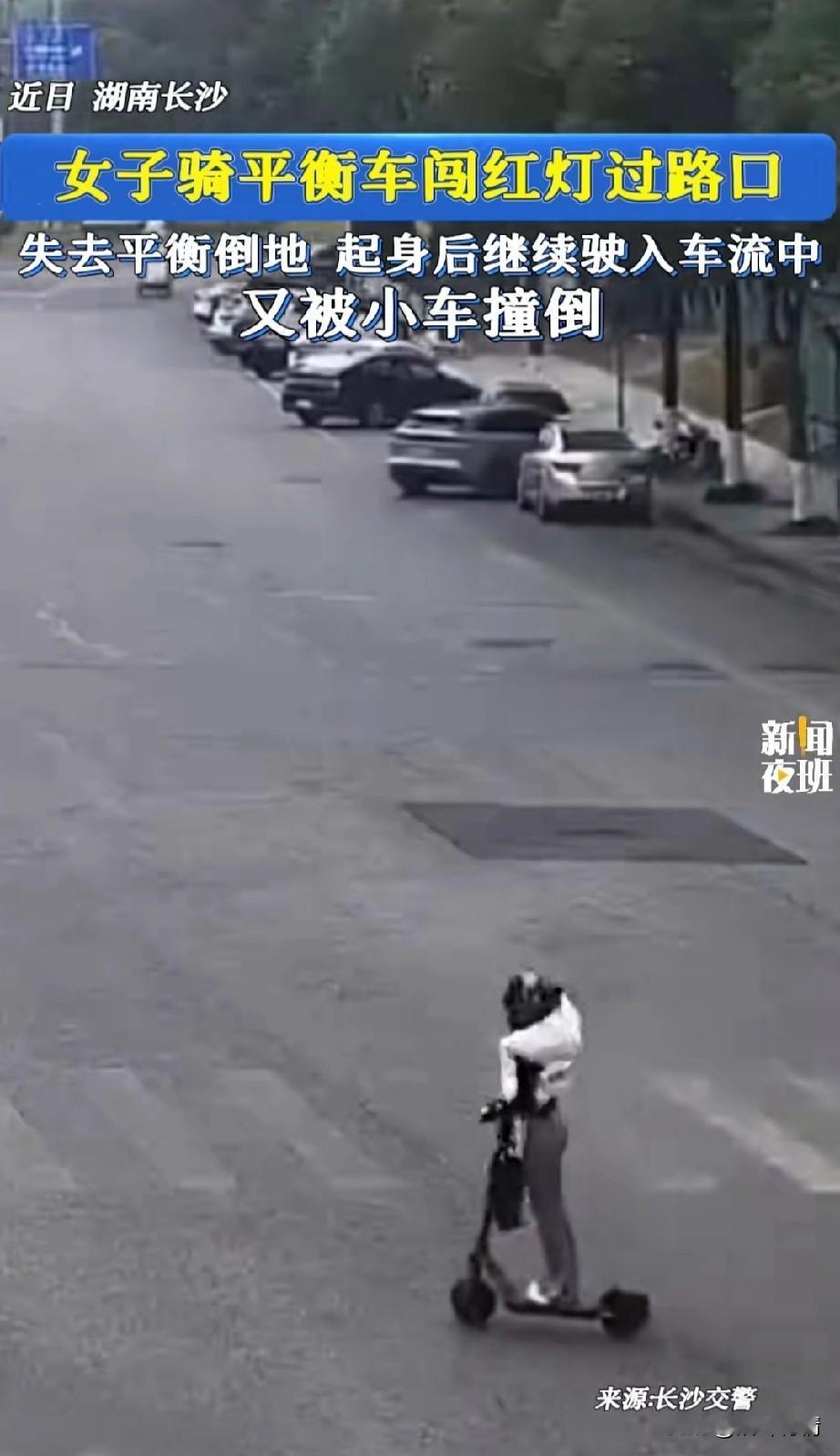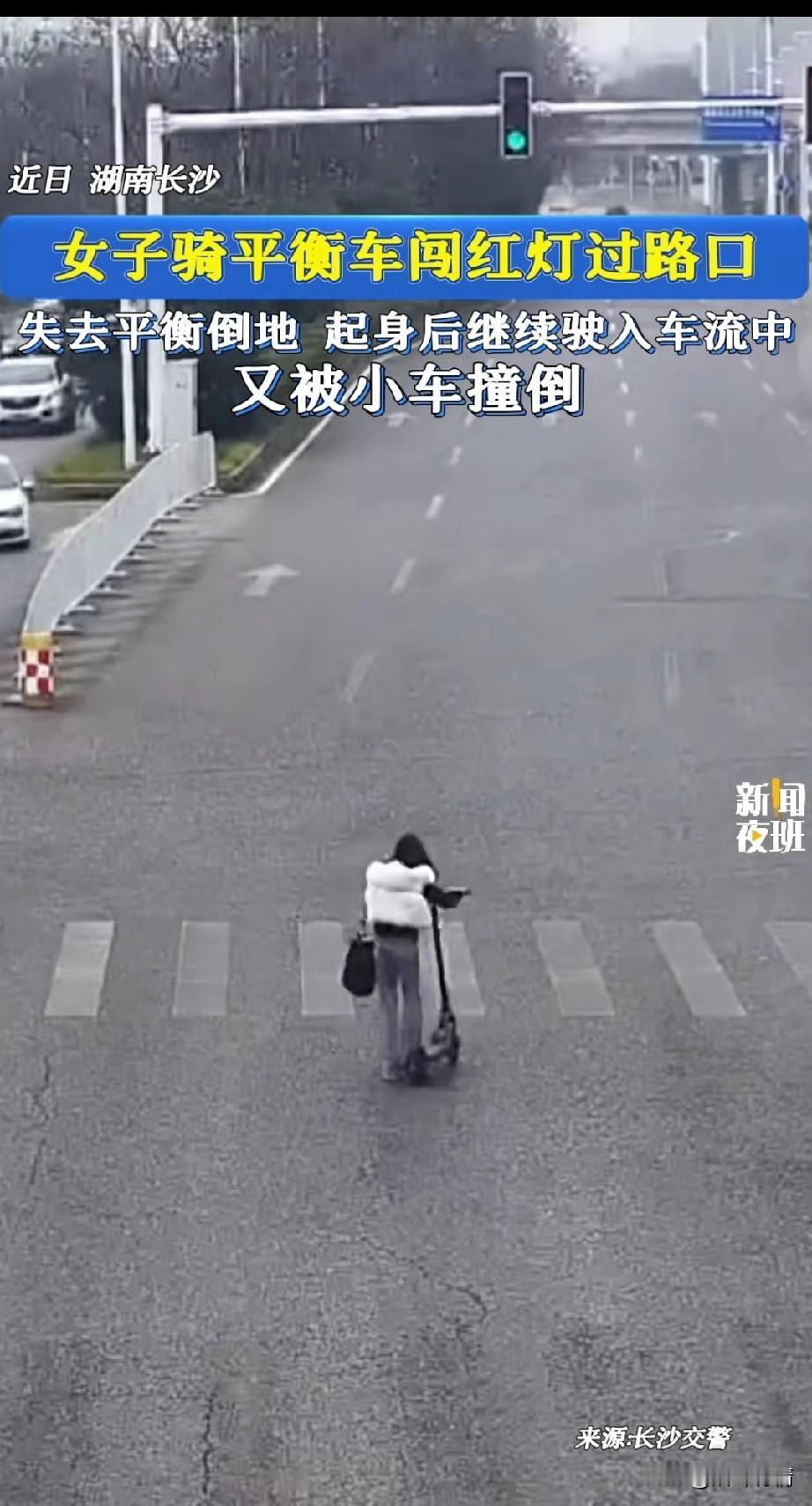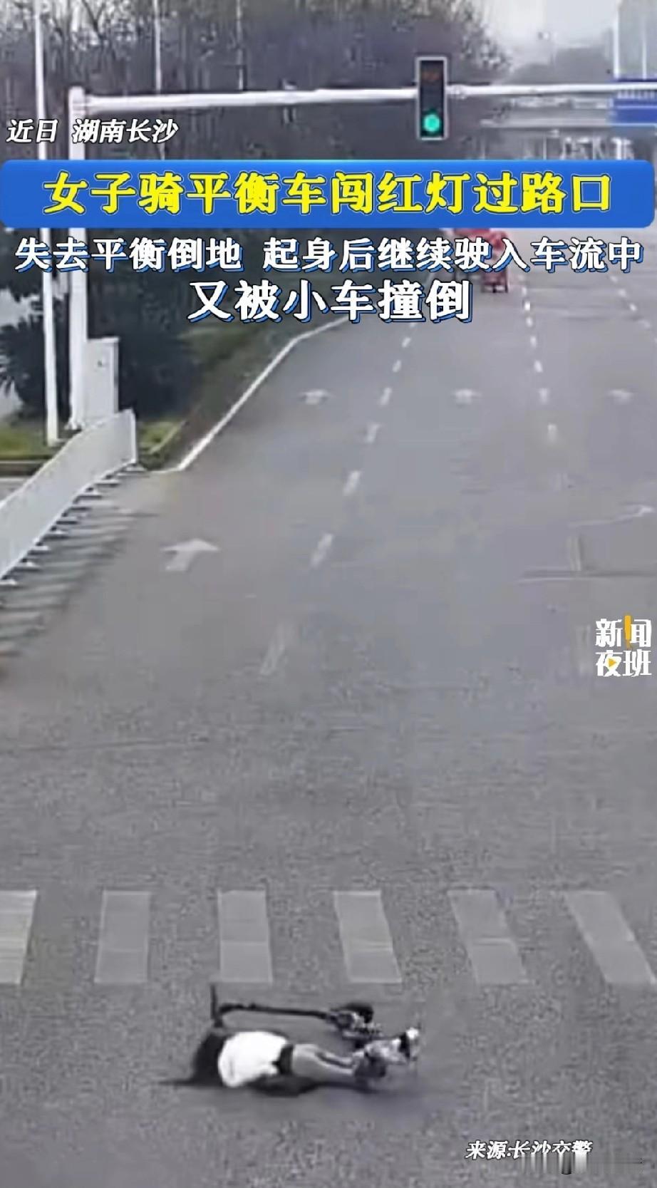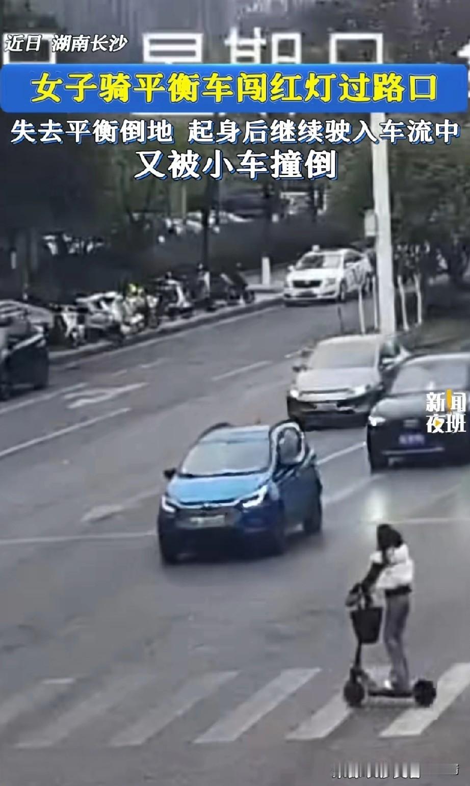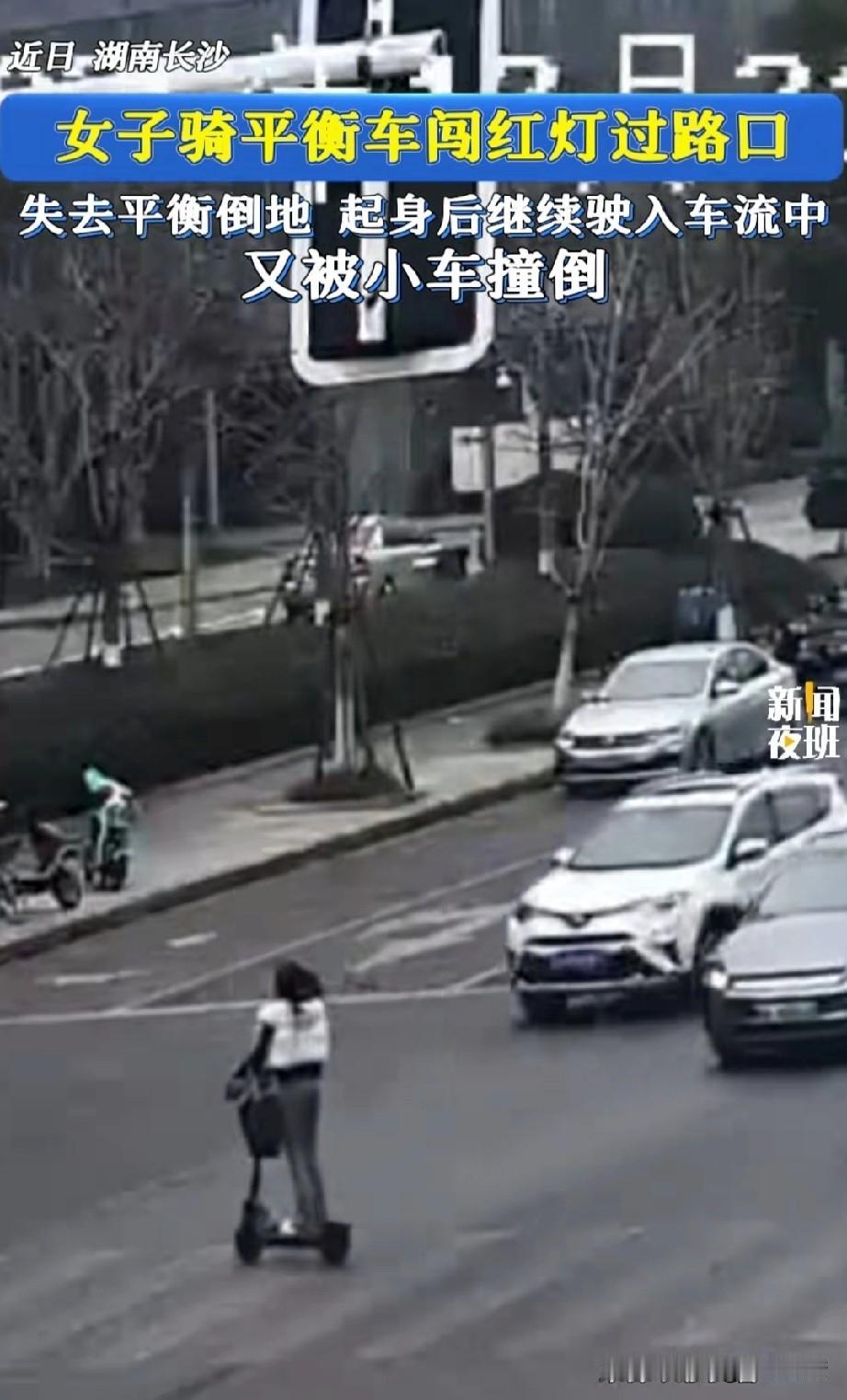 近日湖南长沙女子, 骑着平衡车过马路, 根本不看红绿灯, 还以为马路是她家开的, 结果由于着急, 在马路中央摔倒了, 只见她不紧不慢的爬了起来, 然后继续往前骑行, 出现在对面的对象车道, 人家车辆都是绿灯正常行驶, 她倒不管不过, 直接就冲了过去, 吓得对象而来的蓝色车辆和黑色车辆, 都减慢了速度, 这让她得意不已, 继续悠悠的向前, 由于有视觉死角, 等她快过去马路的时候, 一辆白色SUV冲了过来, 由于躲闪不及, 直接将她撞翻在地, 看着倒地不起她, 想必受伤严重, 幸亏现在路口都有摄像头, 那女子的违法行为被长沙交警放了出来,女子的家人本来还理直气壮, 要求白车司机给予赔偿, 但是当民警将监控视频放给他的家人看了之后,他的家人这才收敛了态度, 来了一句我的家人毕竟受伤了, 咋说也得赔点钱, 叔叔直接告诉他们, 女子是全责, 白车司机没有任何责任不需要赔偿, 你们还需要赔偿白车司机的修车费, 这下女子的家人傻眼了, 他们一直以为谁受伤谁有理, 哪料到现在法律已经改了, 大家对于湖南长沙该女子骑着平衡车闯马路被车撞倒这事怎么看? 交通事故 交通事故那些事 平衡车 湖南一女子摔倒 滑行平衡车 骑行平衡车
