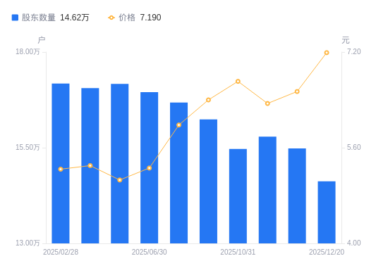 近一年(2024年12月31日至2025年12月20日),驰宏锌锗A股股东户数从17.76万户,减低至14.62万户,降幅17.69%,区间股价上涨29.06%。