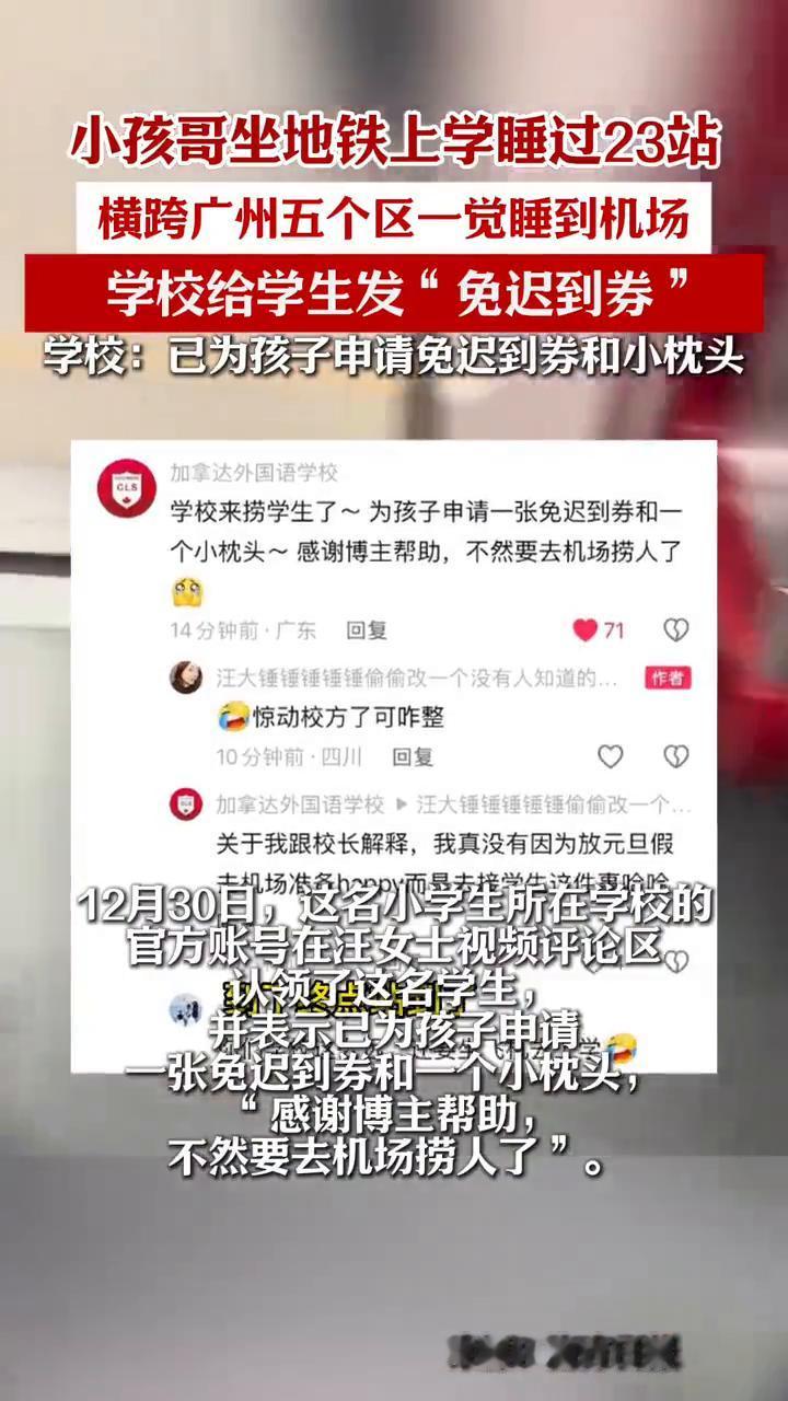 小孩哥坐地铁上学睡过23站,横跨广州五个区一觉睡到机场。学校给学生发"免迟到券"。 12月29日,广州市民汪女士乘坐地铁3号线前往白云机场。到达终点站机场北站时,汪女士注意到名小学生还在车厢过道上熟睡。经询问"小孩哥"睡过整整23站,在梦乡中横跨了广州五个区,睡到了机场。 12月30日,这名小学生所在学校的官方账号在汪女士视频评论区认领了这名学生,并表示已为孩子申请张免迟到券和一个小枕头,"感谢博主帮助,不然要去机场捞人了"。 关于我跟校长解释,我真没有因为放元旦假去机场准备happy而是去接学生这件事。 到了终点站到了,你们学校这么远,还要坐飞机去上学。