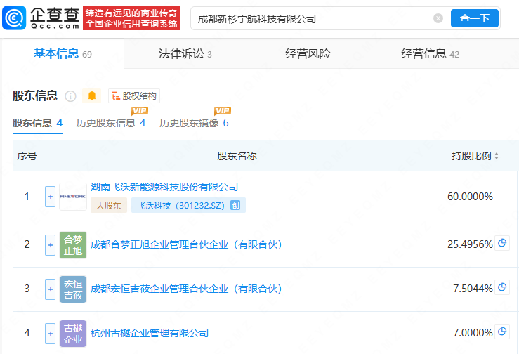企查查APP显示,近日,成都新杉宇航科技有限公司发生工商变更,新增飞沃科技(301232)为大股东,持股比例达60%,同时公司主要人员亦发生变更。