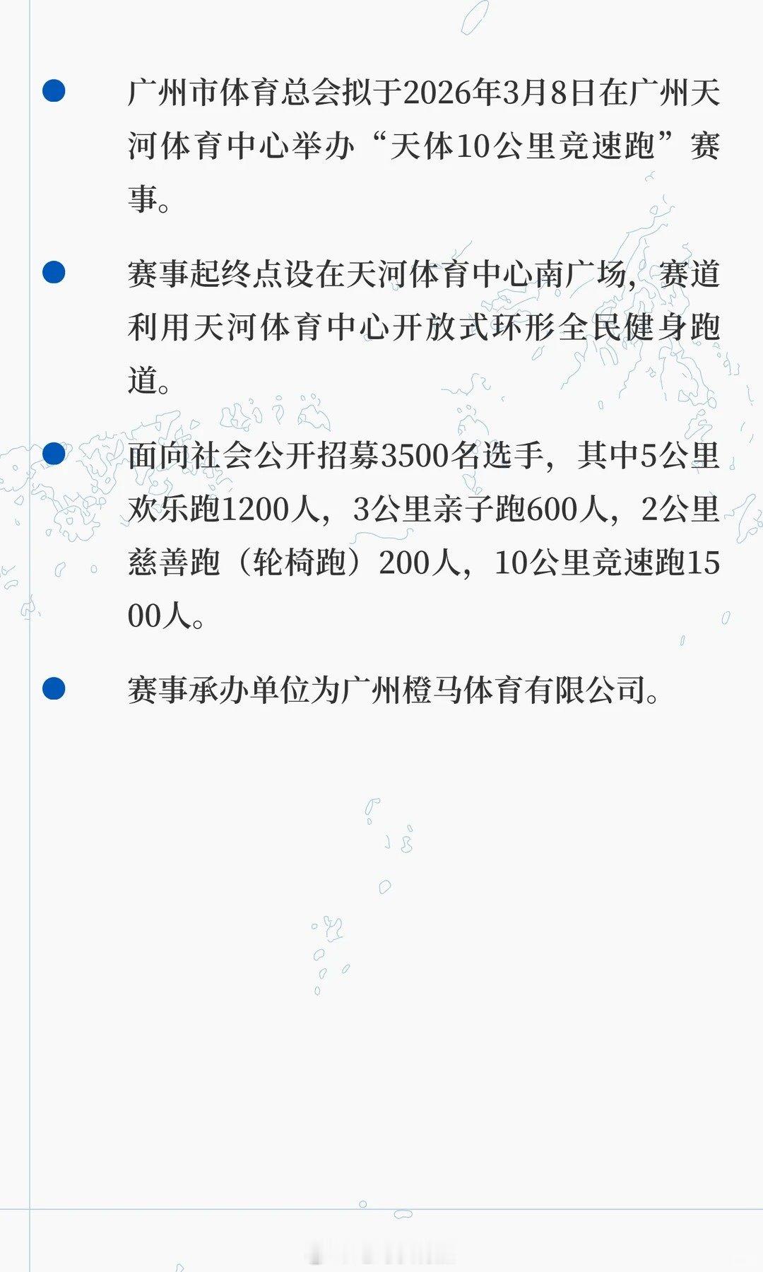 广州市体育总会拟于2026年3月8日在广州天河体育中心举办“天体10公里竞速跑”赛事。赛事起终点设在天河体育中心南广场,赛道利用天河体育中心开放式环形全民健身跑道。面向社会公开招募3500名选手,其中5公里欢乐跑1200人,3公里亲子跑600人,2公里慈善跑(轮椅跑)200人,10公里竞速跑1500人。赛事承办单位为广州橙马体育有限公司。天体10公里 长跑 广州