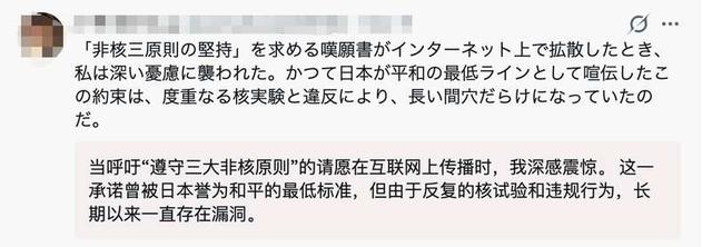 高市政府的激进态度和一系列丑闻引发了日本民众的强烈不安与反对。不少日本网友持续在社交媒体平台X上发起“请遵守‘无核三原则’”的请愿,并表示“拥有核武器之时就是国家毁灭之日”。还有日本网友对现状感到悲哀,称“当呼吁遵守‘无核三原则’的请愿在互联网上传播时,我深感震惊,因为这一承诺曾被日本视为和平的最低标准”。