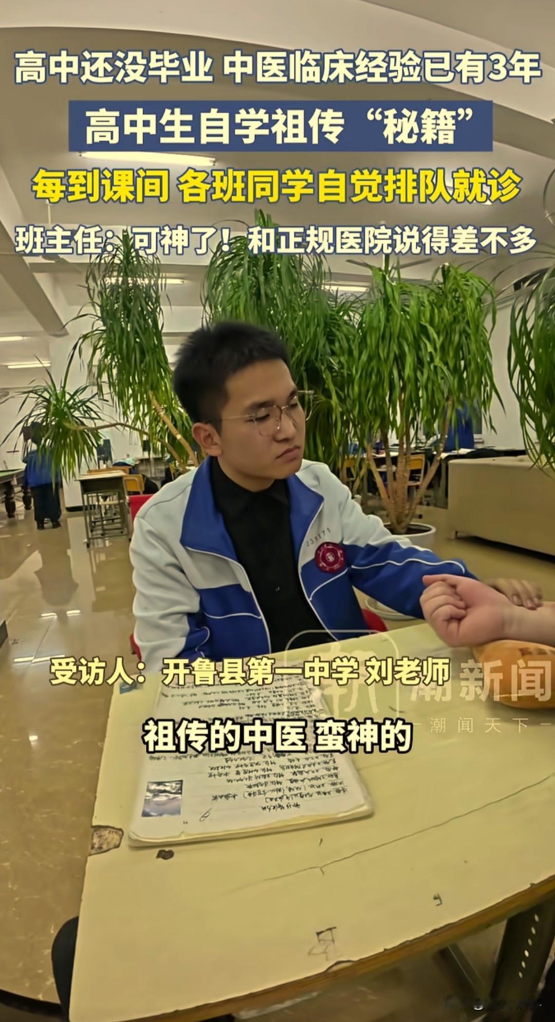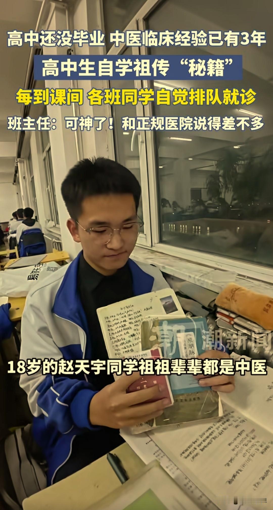 内蒙古高中一男生,小小年纪中医临床经验经验已有三年,在课间时间,教室为同学们提供把脉体验,学校同学排起长队,班主任说:“说的挺准,和正规医院说的差不多”。 这位内蒙古通辽市开鲁县一中学的高三学生赵同学,从小就对中医产生了浓厚的兴趣,祖祖辈辈都是中医,太爷爷留下了不少中医书籍和资料,从小开始自学,上高中的时候利用晚自习后的时间偷偷学习。 几年时间通过阅读中医书籍自学,已经积累了好几本学习笔记,刘老师说:“课间休息的时候,听其他班的同学说,班上有个“小中医”,正好上自习的时候他就去找他把把脉,他也出于好奇,没想到大家反馈看的挺准的”。 网友们看到视频表示赞赏,认为是“传统文化在青年身上的觉醒”,并称赞他为“别人家的孩子”。 也有网友说,看他一脸的中医相,他诊脉的时候专注神态也颇有风范,看神态就像医生,希望他以后也是一位中医领域医学界的名人。