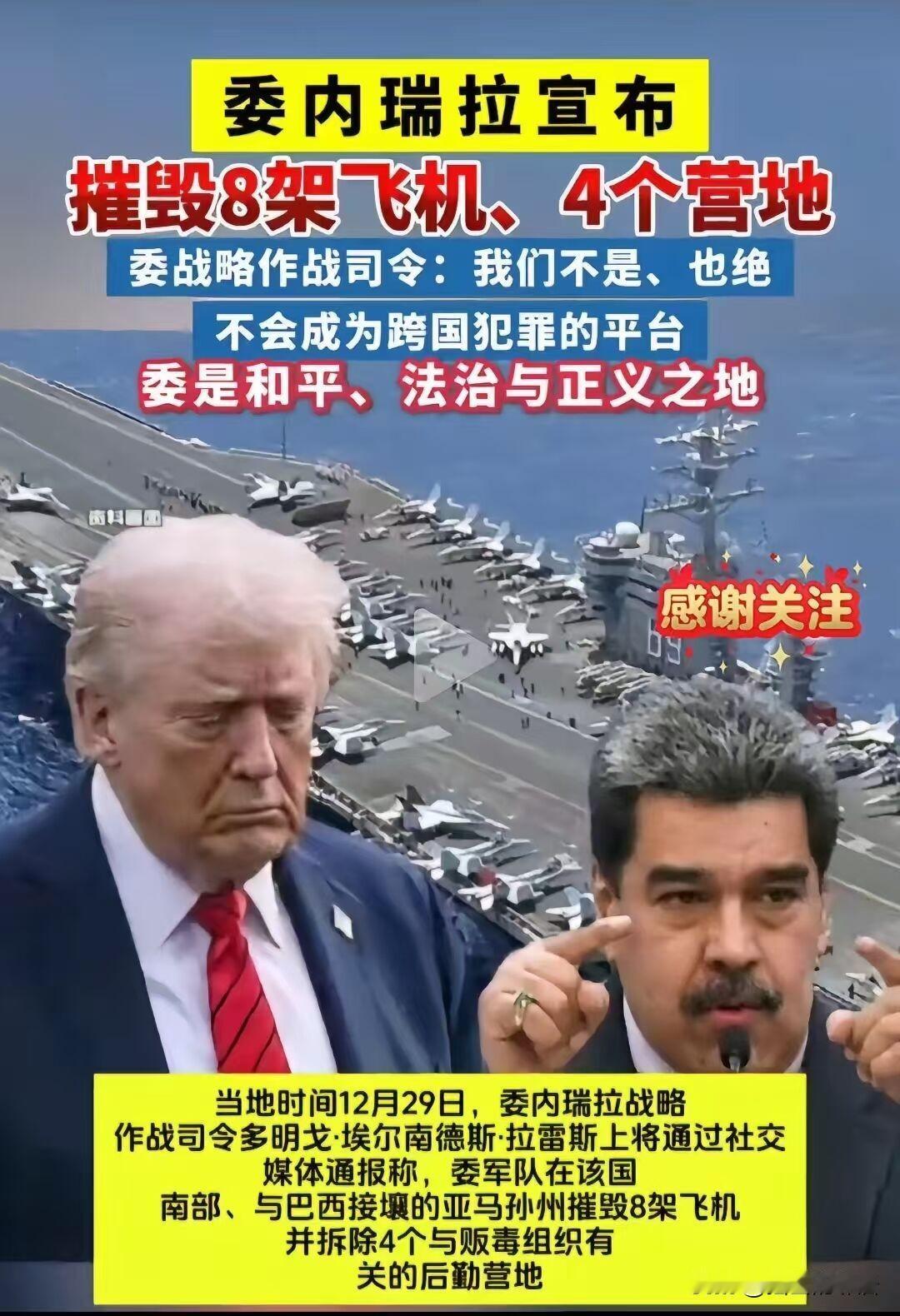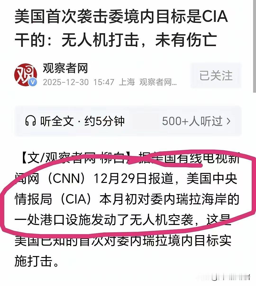 美国和委内瑞拉“打”起来了,但是是以一种奇怪方式。 美国是中央情报局动的手,你没有看错,是CIA中央情报局,我们一直以为是美国间谍机关,不是美国陆海空军不是特种作战部队,甚至特战部队还否认了。名义是打击贩毒,在美国人眼里毒贩是委内瑞拉人。方式是用无人机袭击港口。 这场袭击藏着不少细节,CNN援引知情人士爆料,目标是委内瑞拉沿海一处偏远码头,美方说这里被帮派用来存运毒品,好在袭击时没人,没造成人员伤亡。 特朗普在12月29日直接认了账,对着媒体直言“那个装运毒品的码头炸了大爆炸,现在已经不存在了”,语气里满是炫耀,却不肯说清具体时间和地点。 更有意思的是美方内部的“撇清大戏”,有消息说特战部队给行动提供了情报支持,可特战司令部发言人直接否认,说没给任何形式的支持。 CIA倒是沉得住气,不管外界怎么追问,始终一言不发不置可否,这种沉默反倒坐实了外界的猜测,毕竟这向来是他们秘密行动的常态。 这可不是临时起意,特朗普10月就证实,已经授权CIA在委内瑞拉开展秘密行动,为这场袭击埋下了伏笔。 此前美国的打击都局限在加勒比海公海,击沉过30多艘所谓“贩毒船”,这次直接打到委内瑞拉本土,是已知的首次境内目标袭击。 背后的“南方之矛”军事行动早就铺开,美国在周边部署了1.5万兵力,还有航母打击群和先进战机,架势摆得十足。 委内瑞拉总统马杜罗态度克制,在袭击后近两小时的讲话里没提这事,只强调军队团结,外界分析这是想留着谈判的余地。 但委方也没软着,官方通报说48小时内击落9架贩毒飞机,2025年全年已经打掉39架,用实际行动证明自己也在打击贩毒。 俄罗斯第一时间发声谴责,驻联合国代表说美国的做法像“牛仔”一样鲁莽,完全违反国际法和联合国宪章。 巴西、哥伦比亚等拉美邻国也慌了,公开反对外部军事干涉,毕竟谁也不想自家门口变成地缘博弈的战场。 明眼人都看得出来,“缉毒”只是个借口,CIA擅长的渗透、搅局才是真目的,本质是想通过低风险的秘密行动拖垮对方。 这种绕过正规军事渠道、由间谍机构动手的操作,把单边主义玩到了新高度,也让加勒比海的局势变得越来越危险。 国际社会的担忧不是没道理,这种危险的试探一旦升级,遭殃的最终还是普通民众,和平从来经不起这样的豪赌。 各位读者你们怎么看?欢迎在评论区讨论。