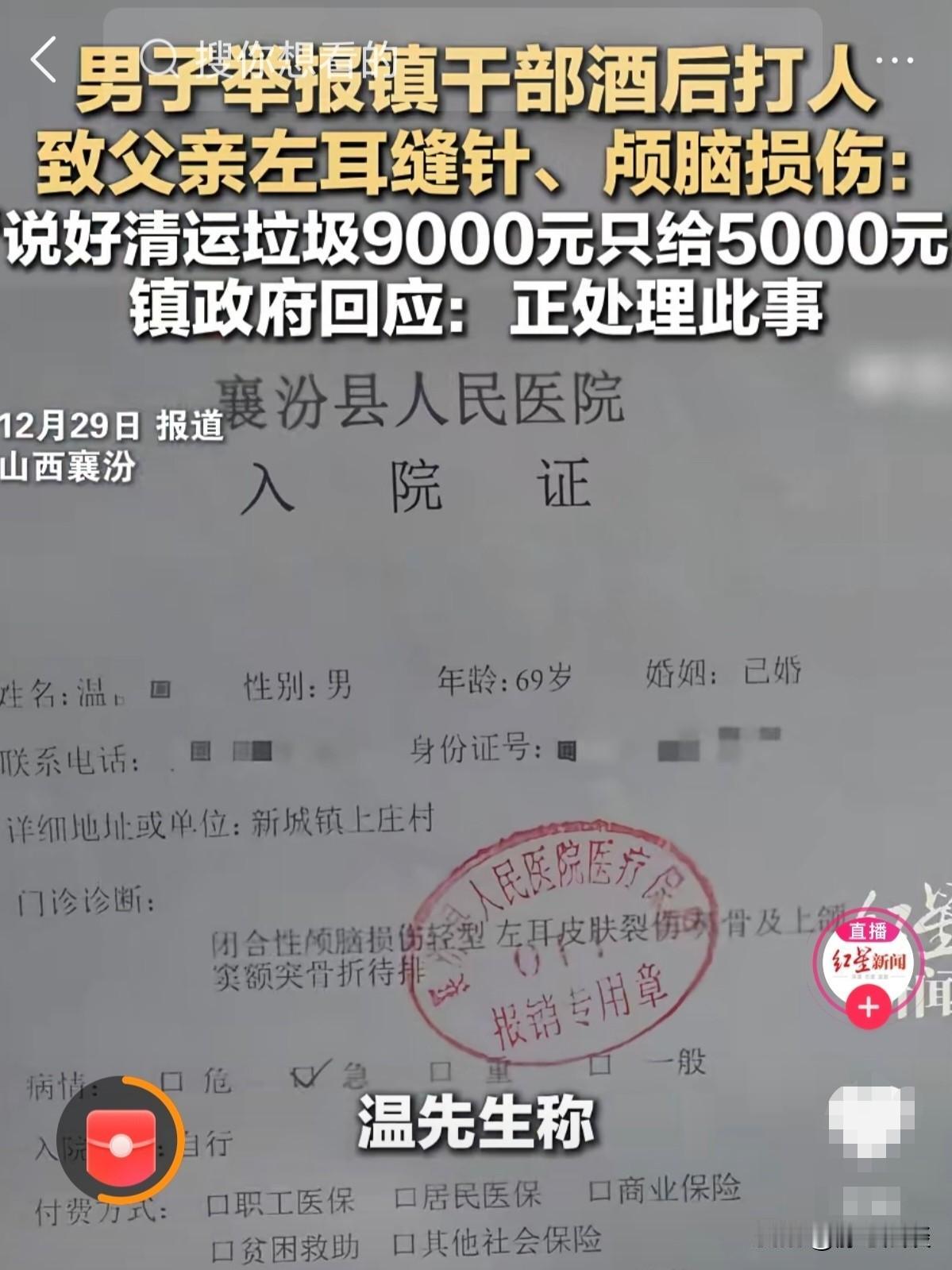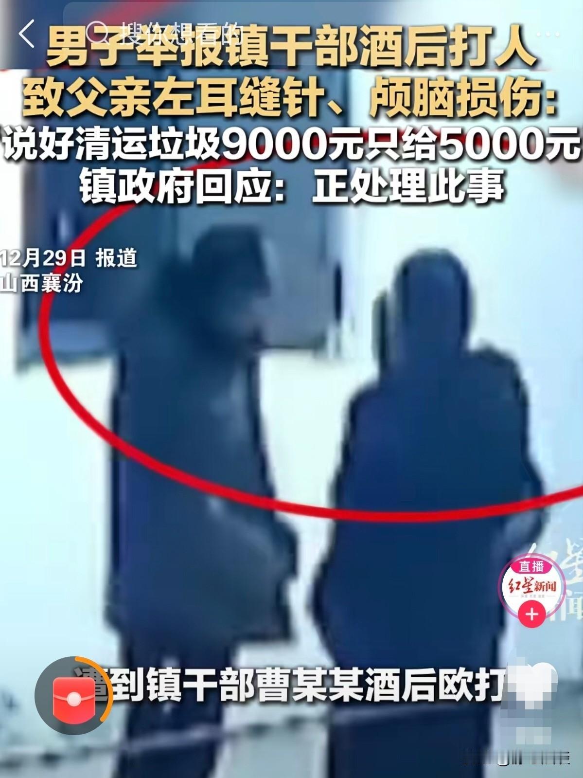 山西襄汾,一大爷为了贴补家用,从村领导手里,揽下3个垃圾池清运的活儿,双方早就说好,干完活年底给9000块钱。等大爷把活实打实干完了,领导却变了卦,只肯给5000元。大爷自然不肯答应,找对方说理,没成想,村领导喝完酒,直接带了两个人,冲到大爷家里,把老人家一顿暴打。事后,老人耳朵缝了两针,听力也跟着受了影响。老人儿子咽不下这口气,直接报警并举报! 温大爷是土生土长的农民,一辈子踏实肯干,到老了也待不住,总想着力所能及找点事干,同时也能贴补家用。 2025年开春,他从村领导手里,揽下村里3个垃圾池清运的活儿。 这份活又脏又累,寒冬酷暑都得清理,再一车车转运,半点不能偷懒。 老温老实本分,干活任劳任怨,实打实把约定的活,干得板板正正。 当初和领导口头讲好,从20259年4月份到12月,把清运的活儿干完,就结9000元劳务费。 这是温大爷大半年辛苦的盼头,也是双方当初一拍即合的约定。 12月27日,约定结束的日子马上到了,温大爷熬到活全部收尾,满心欢喜等着结工钱。 谁成想,领导却突然变了卦,一口咬定只肯给5000元。 平白无故克扣4000元,那可是大爷起早贪黑、顶着异味干活攒下的血汗钱,换成谁都不可能答应。 温大爷不干了,据理力争,不能白出力,说好的事,领导说话不算数,不能失了信用。 工资的事谈不拢,领导觉得老温不识相,不顺从,不给他面子,是大不敬。 温大爷认为,大丈夫一言既出,驷马难追,干了一年的辛苦钱,凭啥少给快一半了。 领导曹某在电话里,就先对着大爷恶语相向,言语间满是蛮横。 可他还不解气,喝完酒,借着酒劲带着俩人直接找上门来。 到了温大爷家里,曹某半点不顾及自己的身份,更不把年迈的大爷放在眼里,进门就动了手,对着大爷就扇耳光。 监控里清晰拍下的那一记耳光,已经是最后一下,可想而知大爷当时承受了多少拳脚。 同行的陌生男子更是上前死死抱住大爷,让他动弹不得,连反抗的力气都没有,只能被动挨打。 一旁的妇女见状心疼老人,急忙上前劝阻,却被随行的人一把拉开,根本没法靠近。 大爷被打后,伤情远比想象中严重,左耳硬生生被打出伤口,缝了整整两针,听力也因此受损,旁人必须大声说话才能勉强听清。 除此之外,他还被诊断为闭合性颅脑损伤轻型,头部持续疼痛,鼻骨及上颌窦额突出,还在医院里接受进一步治疗。 老温没有了往日的精气神,儿子温先生看着父亲受苦,心里又疼又气,咽不下这口气。 当即选择为父亲维权,第一时间向当地派出所报警,一边将家中监控拍下的施暴画面发布到网上公开举报。 《治安管理处罚法》第43条第二款:殴打他人的,或者故意伤害他人身体的,处五日以上十日以下拘留,并处二百元以上五百元以下罚款;情节较重的,处十日以上十五日以下拘留,并处五百元以上一千元以下罚款。其中,“结伙殴打、伤害他人的”属于情节较重情形。 ​ 曹某酒后,带着俩人前往老温家中施暴,陌生男子还抱住温大爷使其无法反抗。 曹某实施扇耳光等殴打行为,完全符合“结伙殴打他人”的情形。 老温被诊断为闭合性颅脑损伤轻型、左耳皮肤裂伤,听力也受到影响,伤情进一步印证了行为的危害性。 目前,曹某被作出行政拘留15日、并处1000元罚款的处罚。 针对曹某存在的其他违纪问题,相关部门将作进一步核查,并依法依规严肃处理。 温大爷辛辛苦苦,干了大半年脏活累活,按约定该拿9000元工钱,结果曹某干完活翻脸不认账。 硬要扣掉4000块,只给5000块,这是典型的欺负老实人、不讲信用。 曹某身为包村领导,本该帮老百姓办事、分忧,结果不仅不解决问题,还酒后带着人上门。 把要账的温大爷一顿暴打,身份和干的事儿完全反过来了,这是典型的干部失德。 温大爷是靠力气吃饭的普通老人,面对能决定工钱的干部,本来就弱势。 曹某不仅利用权力克扣钱,还利用人多势众把老人控制住打,完全是以强凌弱,以势压人。 欠债还钱、打人犯法是基本的法律常识,曹某却无视法律,想扣钱就扣钱,想打人就打人。 曹某身为村领导,干出这种事,既丢了公职人员的本分,更坏了纪律规矩,妥妥的失德失责。 接下来他不光要担之前的处罚,还得面临警告、记过,这都是轻的,搞不好还会被降级、撤职,严重了直接丢了铁饭碗。 对于曹某的所作所为,你怎么看呢? @静心法谈 学法辨是非,慬法不吃亏。