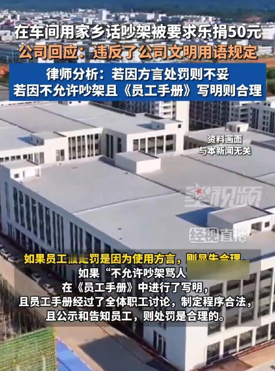 江西,两名员工在车间上班,因意见不和,当场用家乡话争吵,险些动手。事后,公司以两人违反公司文明用语为由,要求两人乐捐50元。网友却吵翻了。 据悉,某公司发出来一张处罚通告,两员工在车间说家乡话,未按照公司文明用语要求,每人乐捐50元。 此通告一出,所有人都觉得莫名其妙! 事发时,计划主管郭某和包装周某因生产计划调整的细节产生分歧。 两人都是本地人,起初用家乡话沟通工作事宜,随后争执逐渐升级,语气越来越激烈甚至互相推搡,险些引发肢体冲突。 周围同事见状赶紧上前劝阻才平息事态 。 公司一个员工透露,当时两人只是吵得凶,并没有辱骂对方,没想到会被公司处罚。 公司80%的员工都是本地人,平时工作中用家乡话交流是常态,之前从未有过相关限制规定,直到这则通告发出后,新来的领导才口头通知禁止在公司说家乡话 。 面对舆论质疑,公司工作人员很快作出回应,称处罚并非因为员工使用家乡话,而是两人在车间公开争吵的行为违反了公司"文明用语"相关规定。 "乐捐"是对其违纪行为的处理,公司从未出台过禁止说家乡话的制度 。 目前,当地工业园区管理委员会已介入此事调查,但对于公司是否有权作出该处罚、相关规章制度是否合法等关键问题,暂未给出明确回应 。 此事曝光后,很多人不解,为什么用家乡话,就被罚款呢? 有人认为,应该处罚,不然的话,小团体都说家乡话,其他人听不懂,不利于团结。 要是用家乡话骂人了,那太不尊重人了。 也有网友认为, "乐捐"本质是变相罚款,涉嫌违法。 罚款属于行政处罚权,只有行政机关有权行使,企业作为民事主体无权对员工罚款。 “乐捐”从字面上看是自愿捐款的行为,但在企业管理中,若员工违反某些规定就被强制要求“乐捐”,这本质上是变相罚款 。 《劳动法》第50条规定,工资应当以货币形式按月支付给劳动者本人,不得克扣或者无故拖欠劳动者工资。 企业以“乐捐”名义克扣员工工资,违反了该法律规定。 不过,如果因方言处罚,公司做法不妥,若因不允许吵架,且《员工手册》写明就合理。 公司的初衷或许是维护车间秩序、倡导文明沟通,但操作上却漏洞百出。 一方面,通告将“说家乡话”与“违反文明用语”绑定,极易引发误解,明明是处罚“争吵推搡”的违纪行为,却把正常的方言交流拖入争议。 另一方面,公司此前没有明确的制度约束,全靠新领导口头通知,这种“临时起意”的管理方式,既让员工无所适从,也失去了制度的严肃性。 真正有效的管理,应该是提前明确“职场争吵、肢体冲突属于违纪行为”,并通过民主程序将规则写入员工手册,而非事后用“乐捐”的名义“秋后算账”。 很多企业喜欢用“乐捐”代替“罚款”,觉得这样听起来更温和。 却忽略了其本质,只要是强制要求员工缴纳的,就是变相克扣工资。 从法律层面来说,企业没有行政处罚权,无权对员工罚款。 即便公司真的有文明用语规定,若没有经过职工代表大会讨论、没有向员工公示,这个规定本身就是无效的,员工根本没有遵守的义务。 对此,你怎么看?