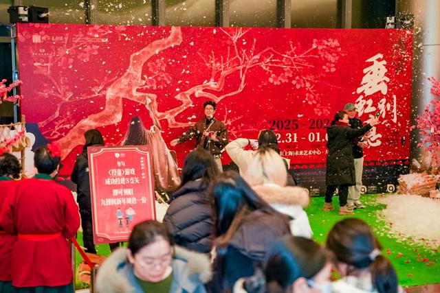 当晚,九棵树未来艺术中心还与苏州湾大剧院进行实时直播连线,同步点燃新年氛围。剧场大屏亮起,两地观众隔空互送祝福。这场“双城双戏”让剧场仿佛化身为一场大型的朋友聚会,观众孙莹铭感慨:“一踏进剧场大门,就感受到浓郁的民俗文化和欢乐的新年气息,这些体验和《垂虹别意·唐寅》的意境太契合了。”