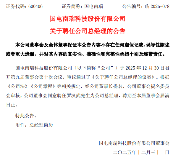 12月31日国电南瑞发布公告,聘任罗汉武为公司总经理。他1975年出生,是正高级工程师,此前曾任国网内蒙古东部电力、国网青海电力的主要负责人,目前同时担任南瑞集团的党委副书记。