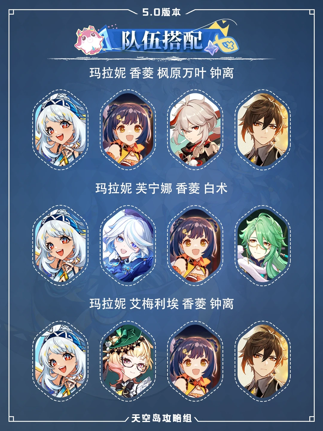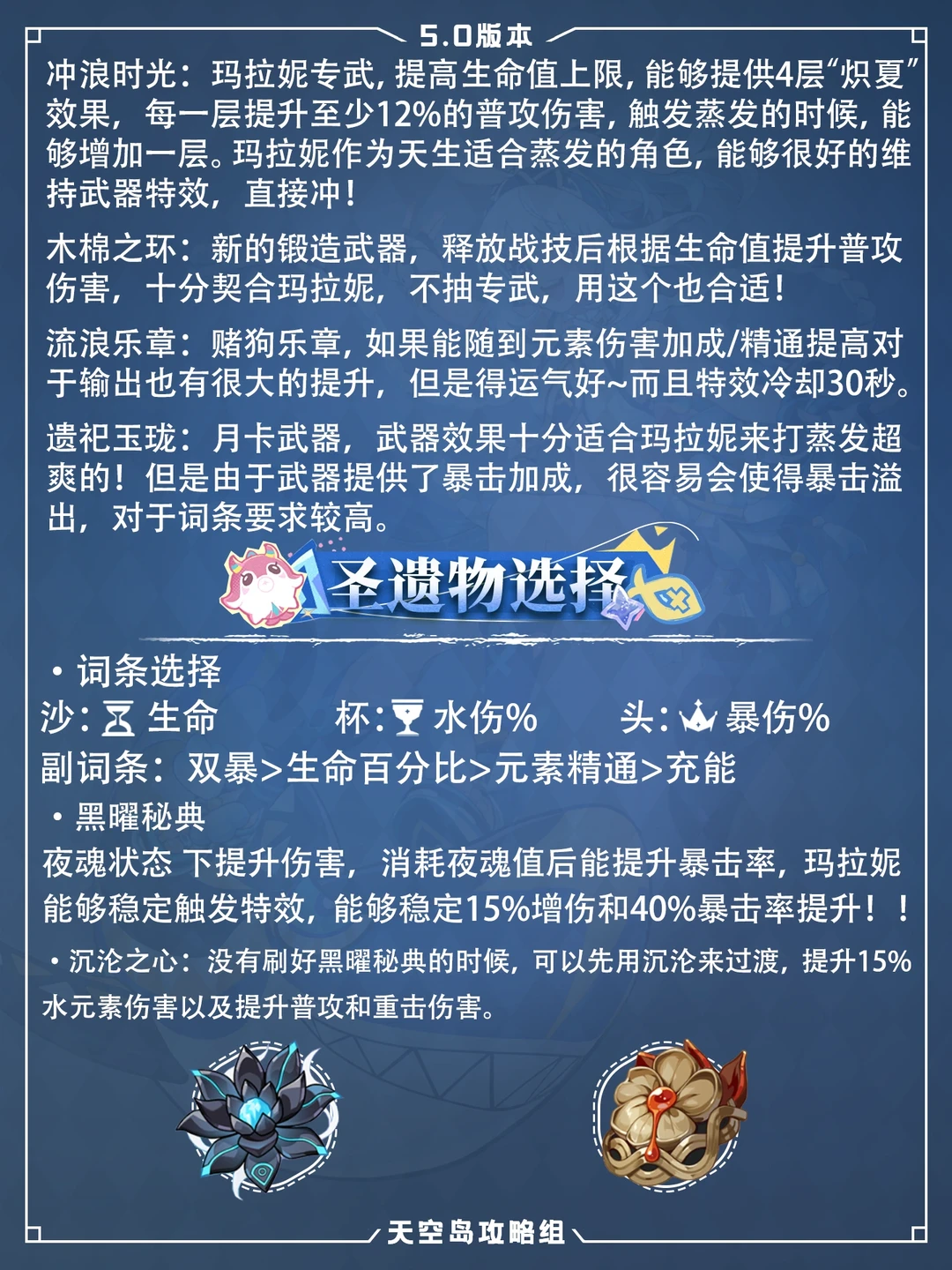玛拉妮跑图与战斗都非常强力,推荐抽取 1⃣建议天赋E(10)>Q(10)>A 2⃣武器选择: 冲浪时光、木棉之环(新纳塔锻造)、流浪乐章、遗祀玉珑(大月卡武器) 3⃣️圣遗物:黑曜秘典、沉沦之心(过渡) 生命沙、水伤杯、暴伤头 副词条:双暴>生命百分比>元素精通>充能 4⃣️配队 玛拉妮+香菱+枫原万叶+钟离 玛拉妮+芙宁娜+香菱+白术 玛拉妮+艾梅莉埃+香菱+钟离 武器、组队、圣遗物等,你不会的看图就懂~