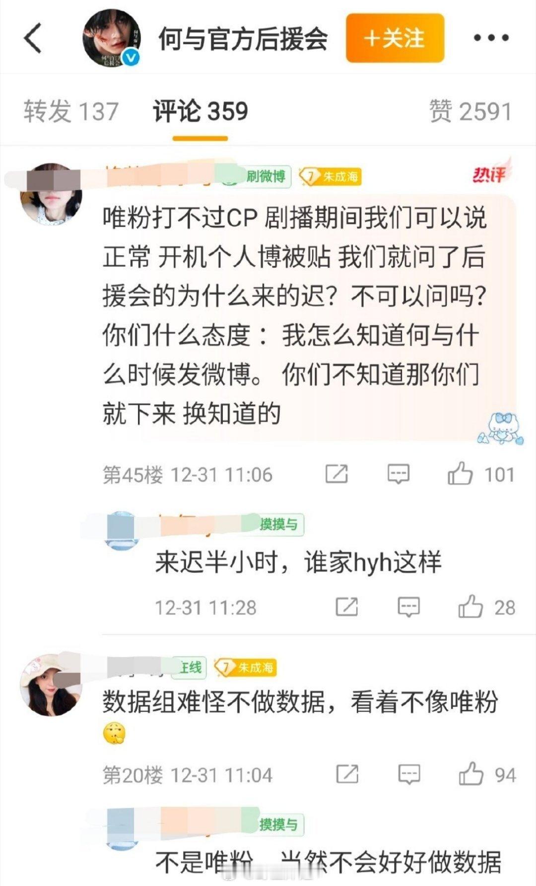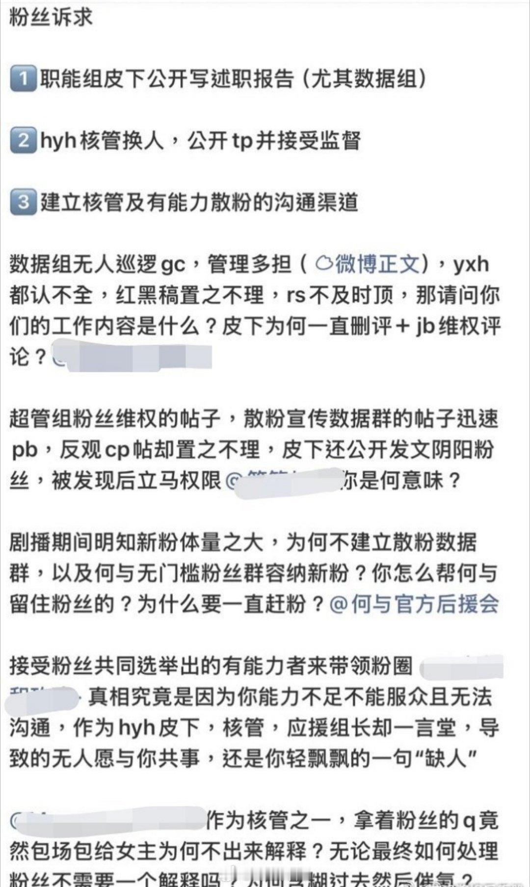 何与的散粉粉丝发文要求何与官方后援会回应一下为什么之前双轨这部剧播出的时候☁️包场包给了女主,新剧角色的名字也写错(言外之意就是官方后援会不干正事,还添乱)