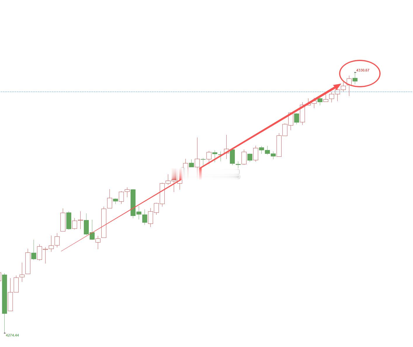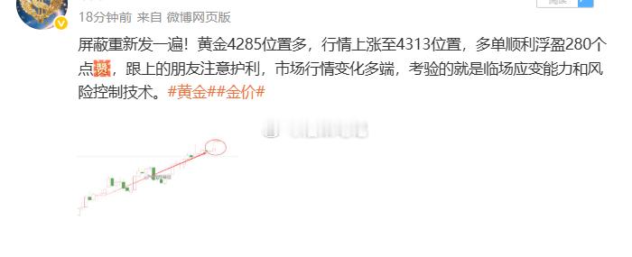 黄金4285位置多,现行情顺利抵达目标4330位置系统止盈450个点,一单系统止