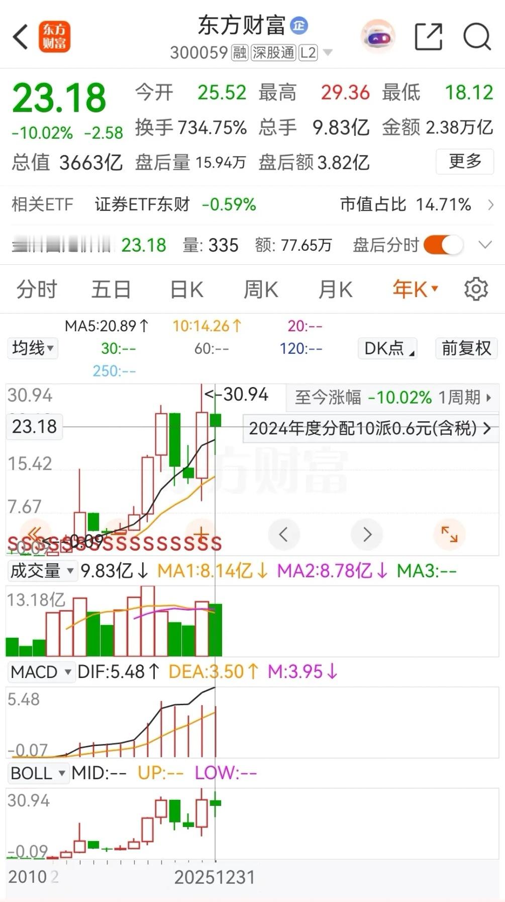 东方财富今日平开后冲高回落,收盘时跌了1.07%,收盘报价为23.18元,被主力资金净卖出了5.4394亿元,月线收出一颗阴十字星,目前是连续四个月收出阴线。今天是年底收官之日,很遗憾今年以绿盘报收,年跌幅为10.02%,当前的总市值为3663亿元。下面简单说说今天的详细走势和年内的整体走势情况。东方财富今天平开震荡后突然直线拉升起来,冲高后震荡回落,午后则是进一步走弱,最终收报于最低价。在资金流向上,今天被主力资金净卖出了5.4394亿元,已是连续三天净卖出,而近五个交易日得合计净卖出额为6.77亿元。从走势上看,自从12月05日的放量中阳线之后,一直都是在横盘整理。对于东财的后续走势,当前主要需面对的是高估值压力、实控人亲属年内减持套现近百亿元,叠加散户持股集中( 股东超101万人),导致波动加剧。在操作上,短期博弈的话,若是激进投资者,可以考虑关注东方财富23~26元区间波段机会,但需成交额保持在1.8万亿以上触发反弹。