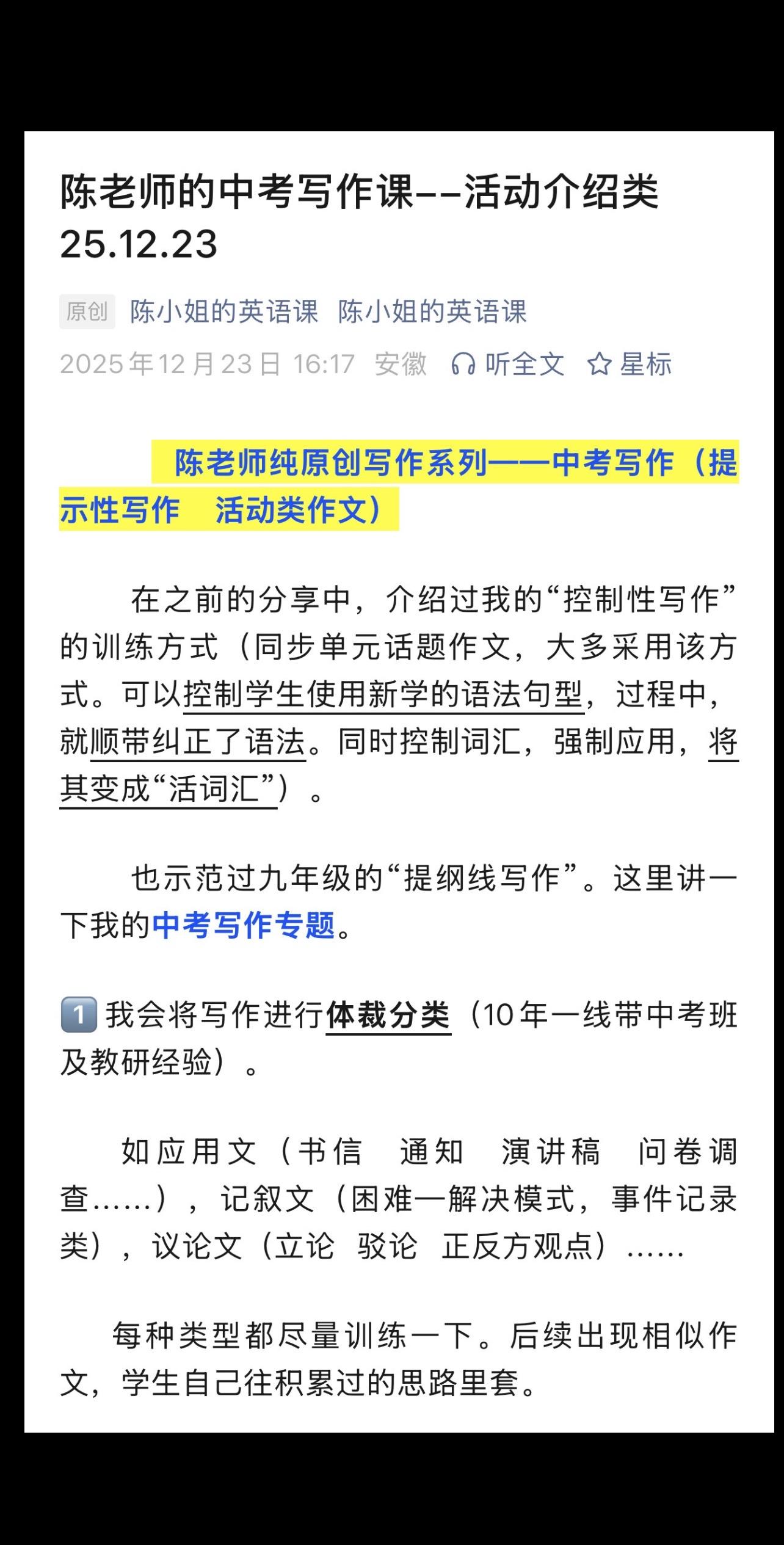 陈老师原创中考写作—活动介绍类12.23。陈老师的原创中考写作教学——活动介绍类示范 2025.12.23