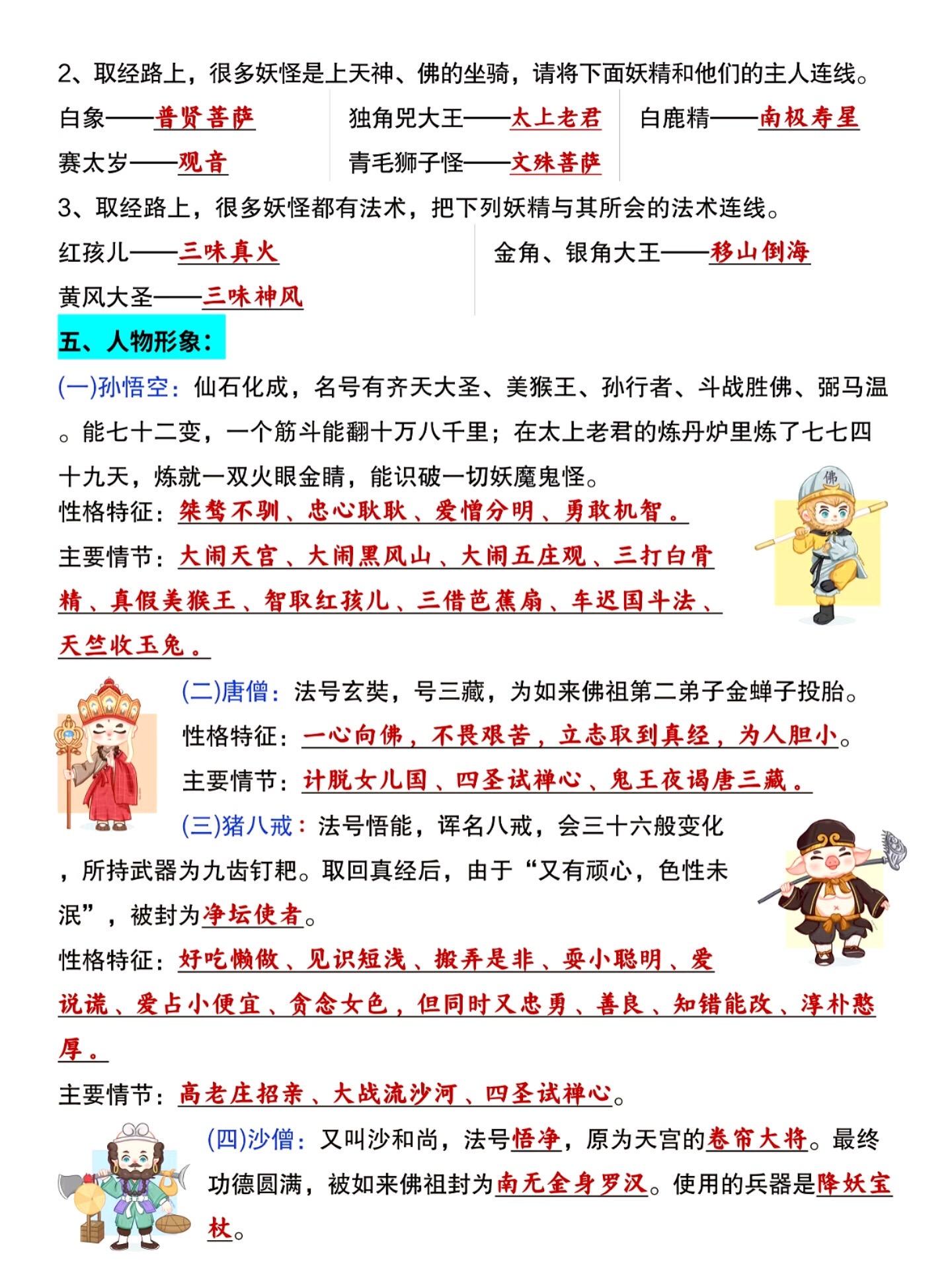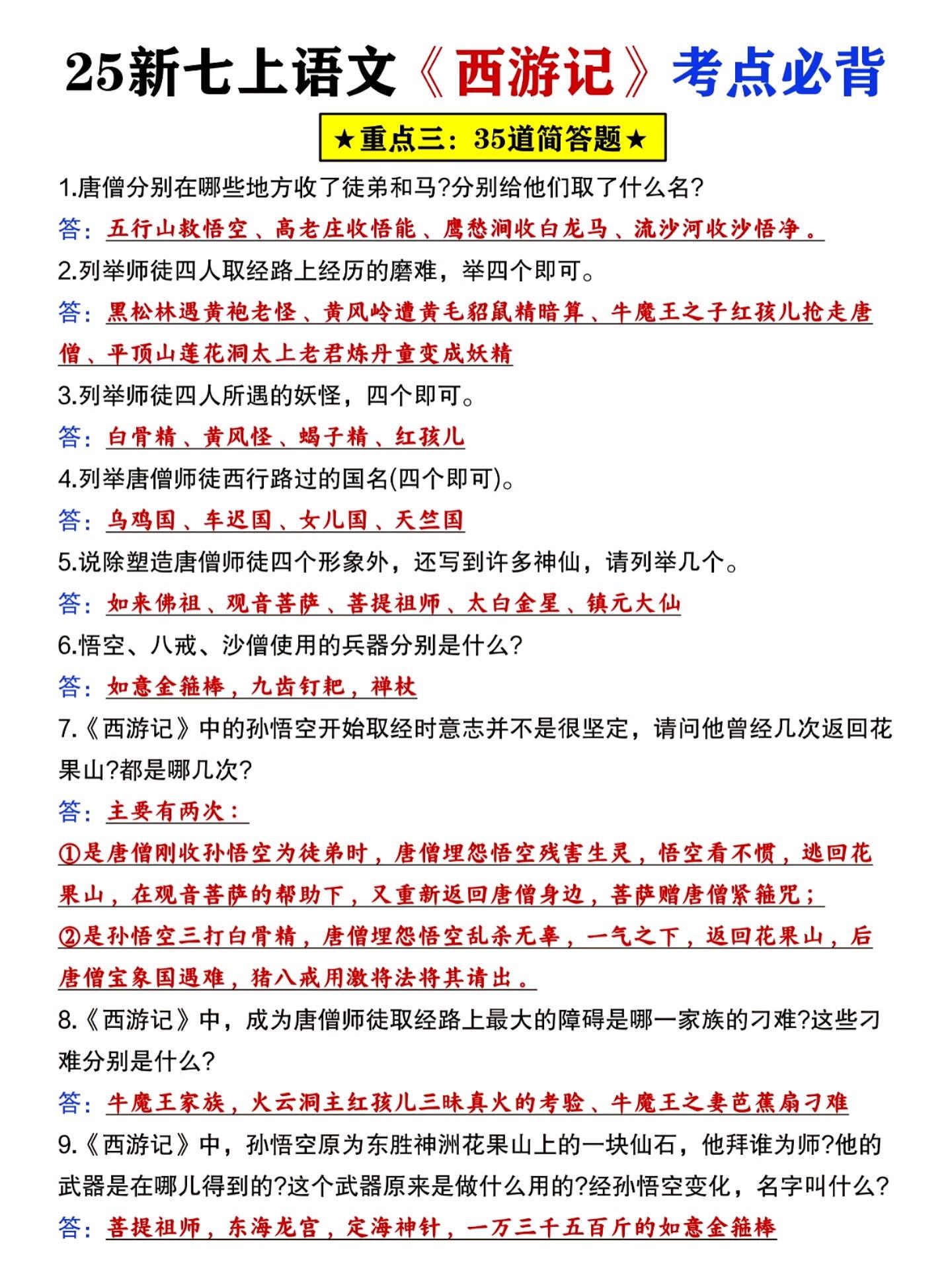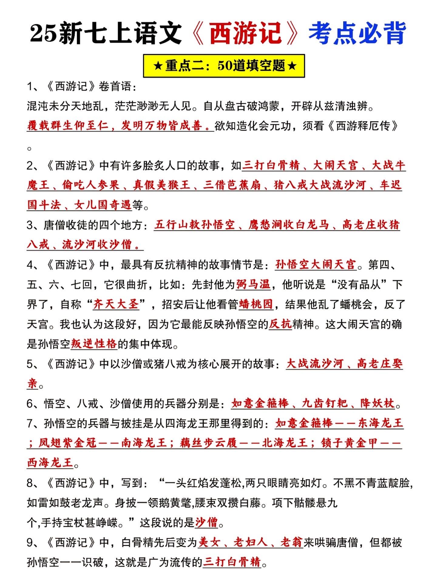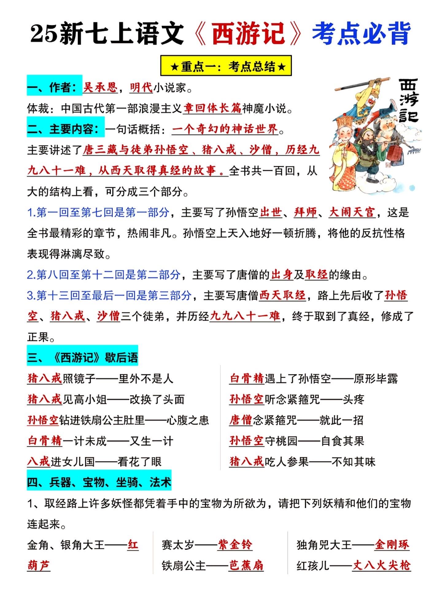 七年级上册语文西游记必背知识点汇总练习。