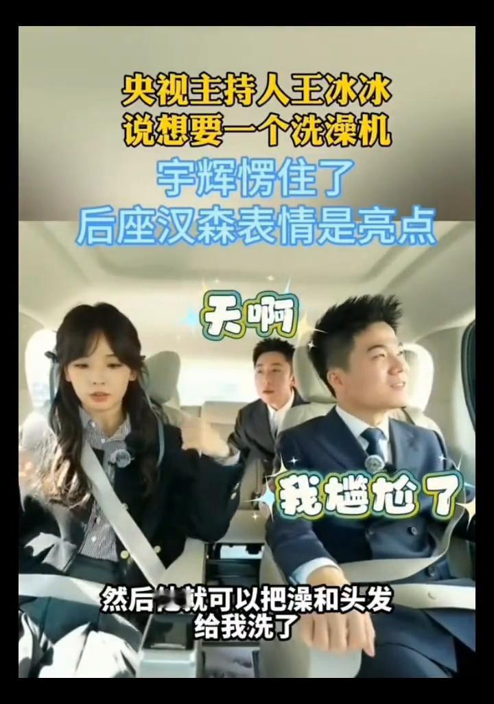 央视主持人王冰冰说想要一个洗澡机,宇辉愣住了,后座汉森表情是亮点。 希望有一个洗澡机,因为每次洗澡感觉特别麻烦,希望可以躺在那,然后它就可以把澡和头发洗了,再吹干。这个样子,我觉得如果能出现这种洗澡机,我一定会特别想尝试一下。