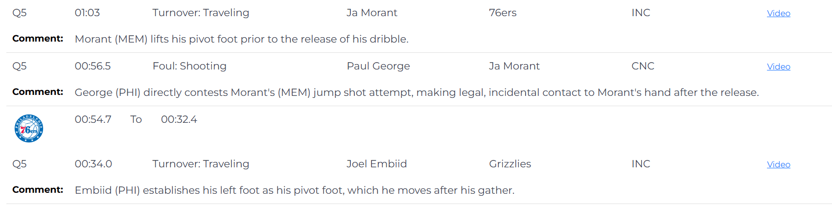 虎扑01月01日讯今日,NBA官方公布了76人与灰熊比赛常规时间与加时赛最后2分钟的裁判报告。