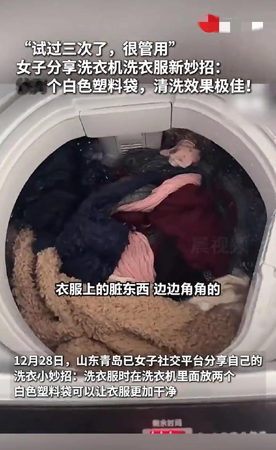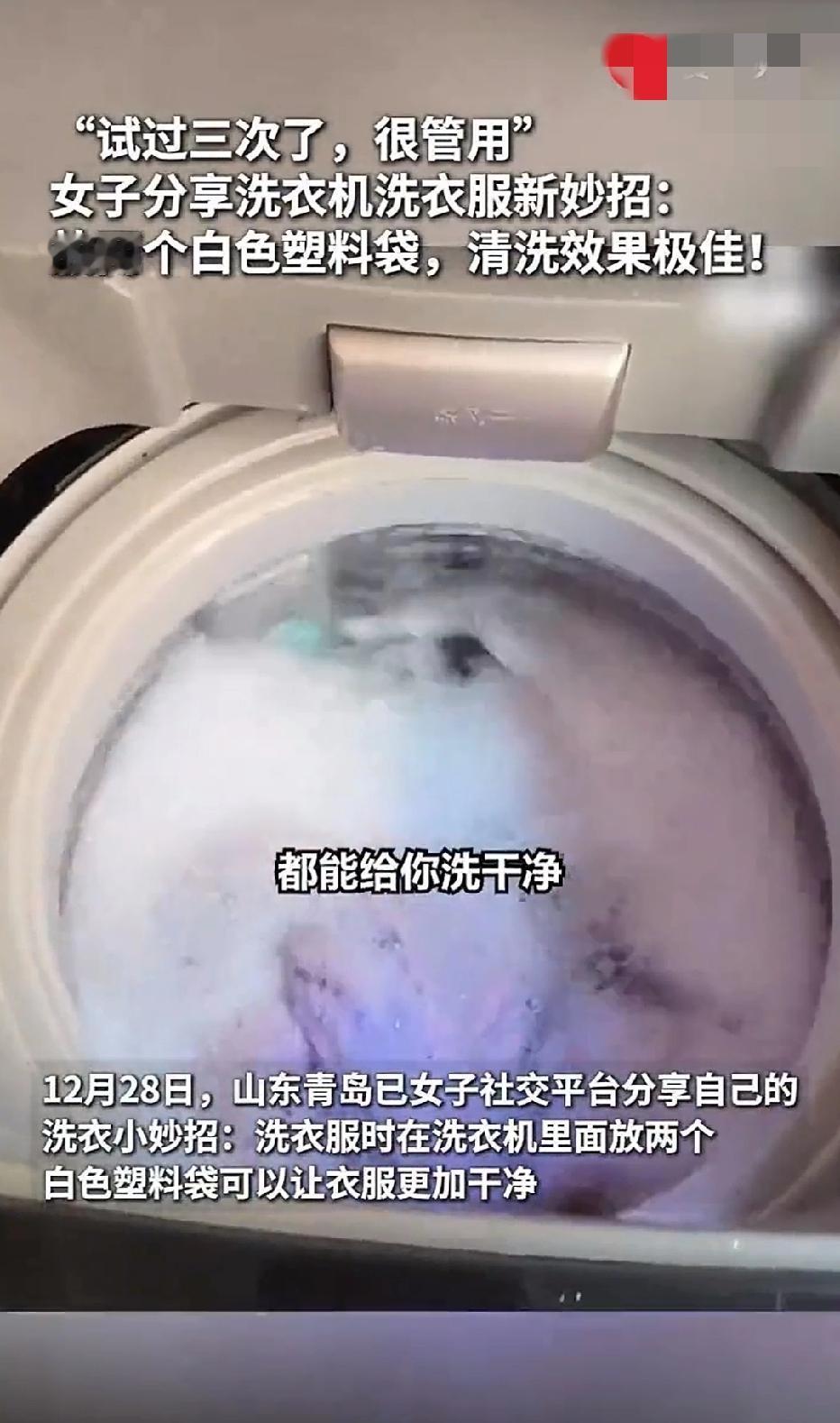 近日山东青岛,一女子在家洗衣服,洗了3次后得出了一个结论,洗衣服时放两个白色塑料袋最好,女子为什么这么说? 原来,女子在家用洗衣机洗衣服,发现每次都洗不干净,于是突发奇想,放两个塑料袋到衣服中间,这样洗衣机转动的时候,不就可以代替手搓衣服的效果!想到就干,女子直接放了两个白色塑料袋进去,发现衣服确实比之前洗的干净了,衣服袖子都洗的白白净净的!于是,女子把这一新发现分享给了大家,让更多人知道!