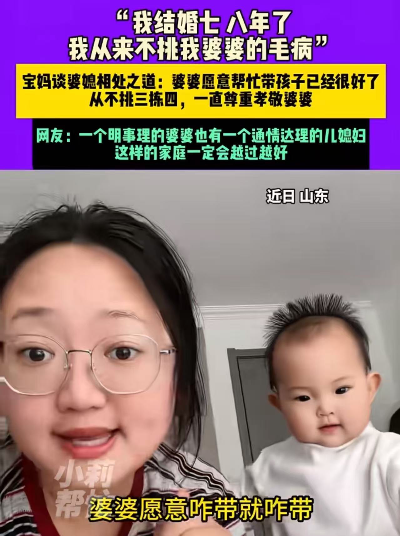 这位宝妈说:“婆婆帮我带孩子的时候,她想怎么带就怎么带。就算带得不是那么完美,我也不会说一句不是。毕竟,就算让我自己来带,我也没办法做到事事都周全、处处都妥帖。有人愿意搭把手,帮我分担这份带娃的辛苦,这已经是很幸运的事儿了。再说了,哪有奶奶不疼自己孙子孙女的呀?婆婆有时候会唠叨几句,我就当作耳边风,左耳朵进右耳朵出。想想结婚之前,我自己亲妈还时不时地唠叨我呢,婆婆其实也和亲妈一样,都是出于关心。我就笑着回应她,没啥大不了的。结婚这么多年了,我一直都尊重婆婆、孝敬婆婆。就算婆婆有些地方做得不太合我心意,但再怎么说,她也是一家人,总比外人强多了。在我们家,几乎不存在什么婆媳矛盾,一家人相处得和和美美。” 此事引发热议,有网友说,我婆婆帮我带孩子。带的咋样我都不会指手画脚。因为我婆婆是真爱啊。对他的孙子孙女比对他儿子都好。那个疼爱啊。孙子吃东西吃不多他就换着花样做!直到吃进去为止。都五岁多了还顿顿饭喂!我说他去学校你也跟着喂?说了不让喂也不听!我知道他是爱孩子的。所以我从不管她愿意咋带都行。