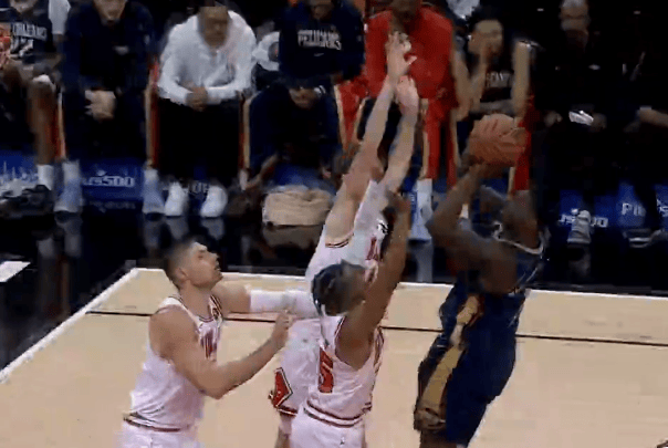 比赛的第二节,威廉森持球反击一条龙,迎着公牛三人扑防抛投打进2+1。