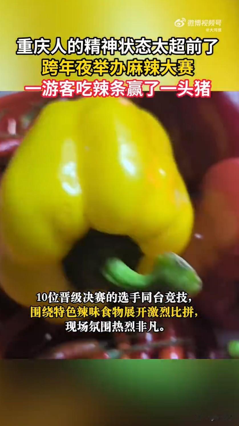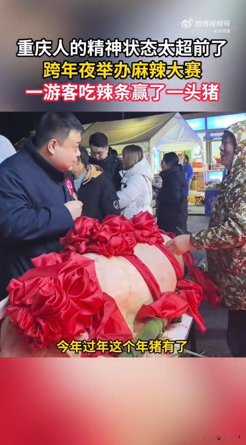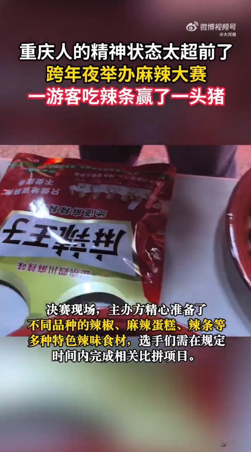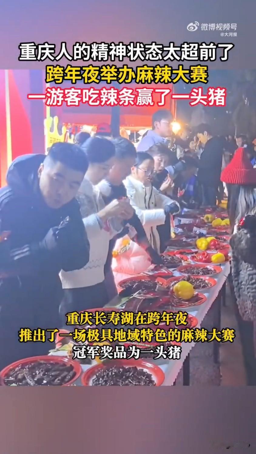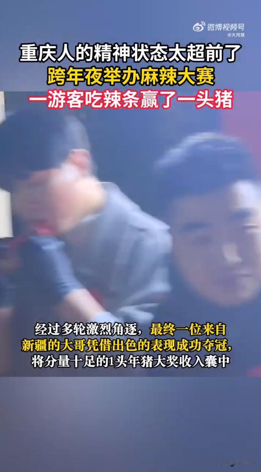 重庆景区这波跨年操作也太会整活了!居然办了场“麻辣大赛”,冠军奖品直接是一头300斤的年猪,这福利让网友直呼“隔着屏幕都想冲过去参赛”!本来是来景区跨年打卡的游客,意外赶上这场吃辣对决,现场气氛热闹到不行,围观的人里三层外三层,手机举得比人还高。 随着裁判一声令下,选手们立马开启“狂炫模式”,有的拿起辣椒直接往嘴里塞,有的对着麻辣蛋糕大口啃咬,辣条更是被嚼得“咔嚓”作响。才刚开始没多久,选手们就个个吃得红光满面,鼻尖冒汗,有的辣得直咧嘴却停不下筷子,有的一边吸气一边猛吃,那股不服输的劲儿引得台下掌声不断。有观众调侃:“这哪是比赛,分明是‘舌尖上的极限挑战’,看着都觉得嘴巴在发烫”,还有人开玩笑说“重庆的跨年,连比赛都离不开麻辣,果然是无辣不欢的城市”。 这场比赛不光比谁吃得多,更比谁的耐辣力强。中间有几位选手实在扛不住辣味,放慢了速度,但还是硬撑着不肯放弃,毕竟300斤的年猪诱惑力实在太大。而来自新疆的大哥全程稳如泰山,吃起辣椒来面不改色,不管是爆辣的小米辣还是麻味十足的辣条,都吃得又快又香,仿佛在吃普通零食,看得全场观众惊呼连连。 围观的路人更是比选手还激动,有人举着手机全程录像,嘴里还不停喊“加油”,有人看得直咽口水,调侃说“本来是来看风景的,结果被这场面看馋了,感觉比自己吃还过瘾”。还有小朋友拉着家长的手问“他们为什么吃这么辣还在笑呀”,逗得周围人哈哈大笑。选手们的表现也各有亮点,有位大哥吃辣时面不改色,节奏稳得像在吃家常菜;还有位小姐姐看着柔弱,吃起辣椒来一点不含糊,让旁边的男选手都忍不住点赞。 最终的冠军被一位来自新疆的大哥拿下,他全程从容不迫,不管是猛辣的鲜辣椒还是齁辣的甜品,都吃得津津有味,最后以绝对优势赢下了那头300斤的年猪。据大哥说,自己平时就爱吃辣,没想到这次跨年旅游还能靠这手艺赢个大奖,实在太惊喜了。网友们看到消息后纷纷留言“新疆大哥果然深藏不露,吃辣实力藏不住”“重庆跨年也太卷了,别人跨年看烟花,这里跨年赢年猪,主打一个不白来”“这才是跨年的正确打开方式,又刺激又有福利”。 这场麻辣大赛不光让游客们度过了一个欢乐又难忘的跨年,还把重庆的麻辣文化展现得淋漓尽致。既能欣赏景区风光,又能看高手过招吃辣,运气好还能抱走大奖,难怪大家都说,重庆的跨年从来不会让人失望,这波“以辣会友”的操作,实在太会了!重庆新年活动 来源:大河报