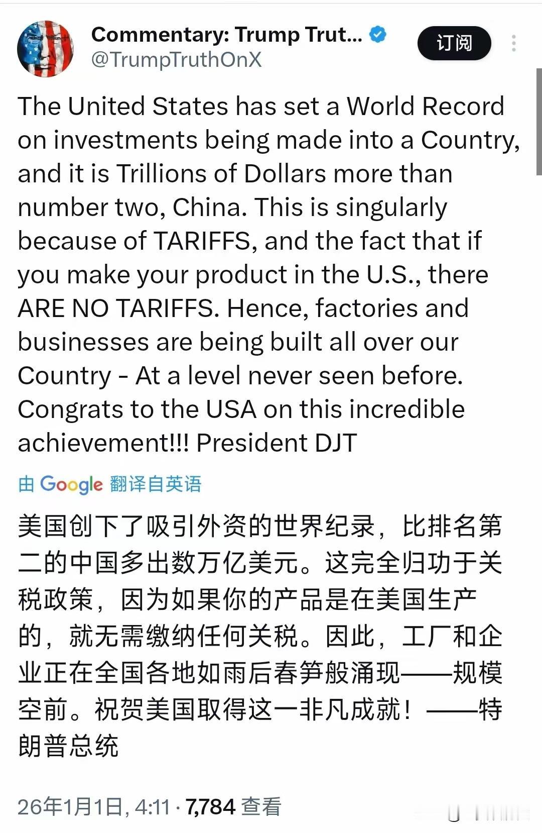 特朗普今天(北京时间1月1日)发文写道:“美国创下了吸引外资的世界纪录,比排名第二的中国多出数万亿美元。这完全归功于关税政策,因为如果你的产品是在美国生产的,就无需缴纳任何关税。因此,工厂和企业正在全国各地如雨后春笋般涌现规模空前。祝贺美国取得这一非凡成就!” 这新年钟声敲响才多久,特朗普就迫不及待地给美国经济发来一封“贺电”。他笔下的美国,简直成了全球资本的狂欢胜地,功劳全记在了他那套“关税大棒”的账上。听起来就像是,只要竖起关税高墙,财富就会自动从世界各地涌向美国。 但现实世界的经济剧本,真能写得这么简单粗暴吗?看看国际货币基金组织的数据吧,2025年美国吸引外国直接投资的数据确实亮眼,预计能超过3500亿美元。中国呢?预计依然能稳稳保持在2000亿美元以上的规模。 这“数万亿美元”的差距从何说起?这更像是竞选舞台上精心设计的数据魔术,一种典型的“特朗普式夸张”。他的逻辑链条很清晰:高关税逼着企业把工厂搬回美国,工厂一多就业就好,美国就赢了。听起来无懈可击,对吧? 可经济学家们听到这套理论,估计只能摇头苦笑。关税这玩意儿,本质上是一把双刃剑。它可能暂时保护了国内的几个工厂,但抬高的进口成本最终会转嫁给美国的消费者和企业。世界贸易组织早就警告过,单边贸易保护措施会破坏全球供应链,拖累所有人。 而且,资本的流动远比关税复杂得多。企业选择在美国投资,看中的可能是那里庞大的消费市场、依然领先的科技生态,或者是各州政府给出的巨额税收优惠。把数千万甚至上亿的投资决策,简单归功于“怕被关税打”,实在小看了全球企业家的智商。 更耐人寻味的是,就在特朗普猛夸自己政策的同时,不少美国本土制造商却在私下叫苦。从海外进口的钢铁、铝材、元器件统统变贵了,他们的生产成本水涨船高,产品在国际市场上的竞争力反而被削弱。一些“回流”的工厂,自动化程度极高,创造的就业岗位远不如预期。 这种叙事营造出一种“美国独赢”的幻象,却刻意忽略了全球经济的共生关系。中国作为“排名第二”的引资大国,其2000多亿美元的体量本身就是一个奇迹,背后是完备的产业链、不断优化的营商环境和澎湃的科技创新动力。 特朗普的这番话,目标听众非常明确。它与其说是一份经济报告,不如说是一封写给国内支持者的动员信。在政治季里,一个简单、有力、充满对抗性的故事,往往比复杂的经济学原理更能打动人心。 全球化的棋盘上,没有谁能靠单边主义和自我封闭真正“赢麻了”。资本有自己的腿,它会用脚投票,奔向真正能产生回报、安全稳定的地方。当口号散去,账单迟早会来。 各位读者你们怎么看?欢迎在评论区讨论。 特朗普政策变脸 川普特朗普 美国特朗普关税 特朗普征加关税 特朗普经济困局 特朗普经济霸权