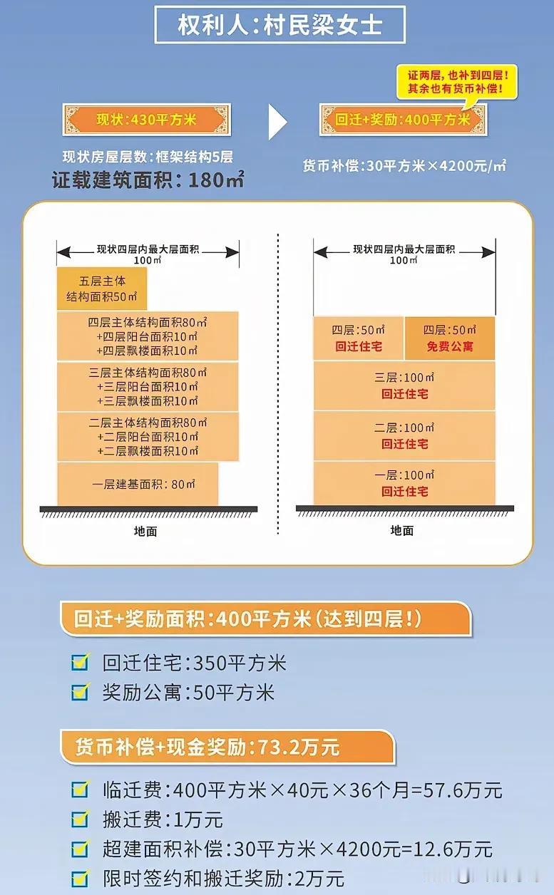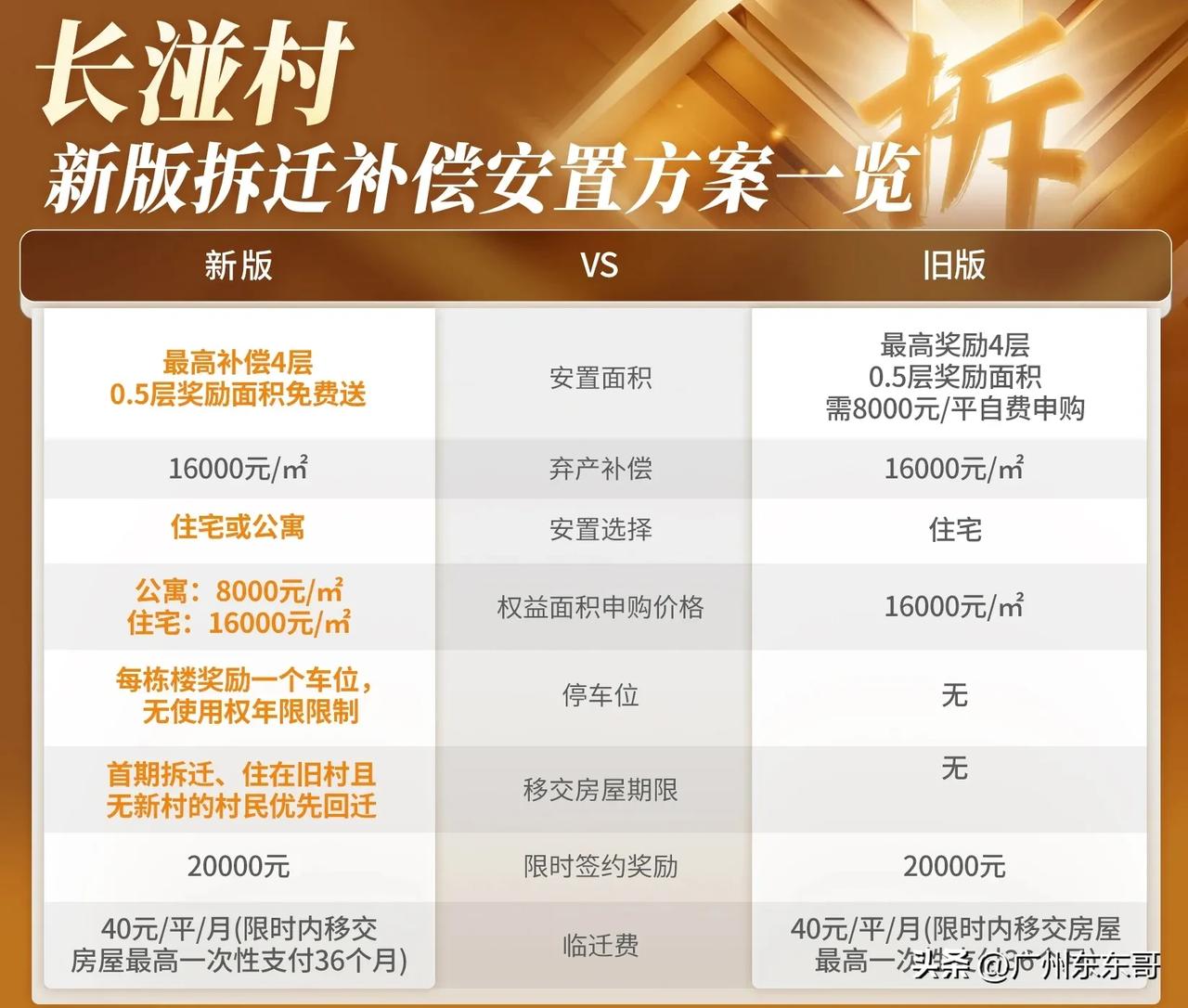 补偿先行,奖励丰厚!天河长湴村旧改拆补新方案! 安置房面积直接奖励四层半,不需要村民另外掏钱。 权益面积申购,也从统一的1.6万/平,改成公寓8000元/平,住宅1.6万/平。 车位按照楼栋免费送,且没有使用年限。 经过修改后补偿方案,已经有不少的提升了。如果要对标元岗村还是有一定距离的,能不能获得村民的认可,只能等到一次一次的表决大会了。