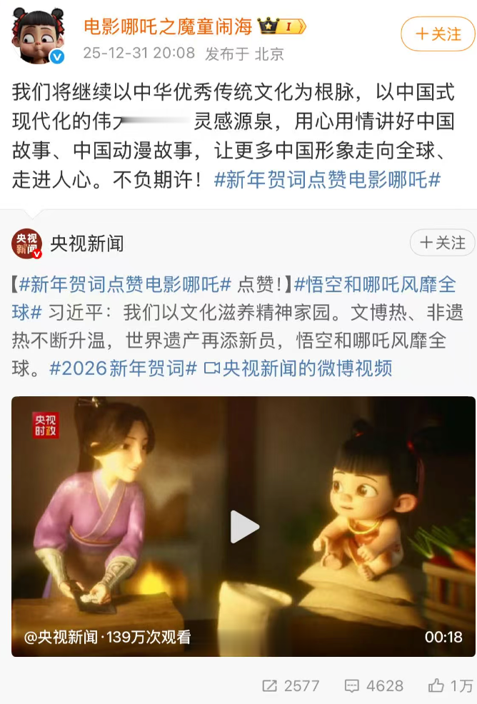 新年前夕,国家主席习近平发表2026年新年贺词。他在贺词中提到,“文博热、非遗热不断升温,世界遗产再添新员,悟空和哪吒风靡全球,古韵国风成为年轻人眼中的‘顶流审美’。”