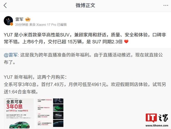 IT之家1月1日消息,小米创办人、董事长兼CEO雷军今日透露了一组数据:小米首款豪华高性能SUV——小米YU7上市6个月,交付已超15万辆,是SU7同期2.3倍。