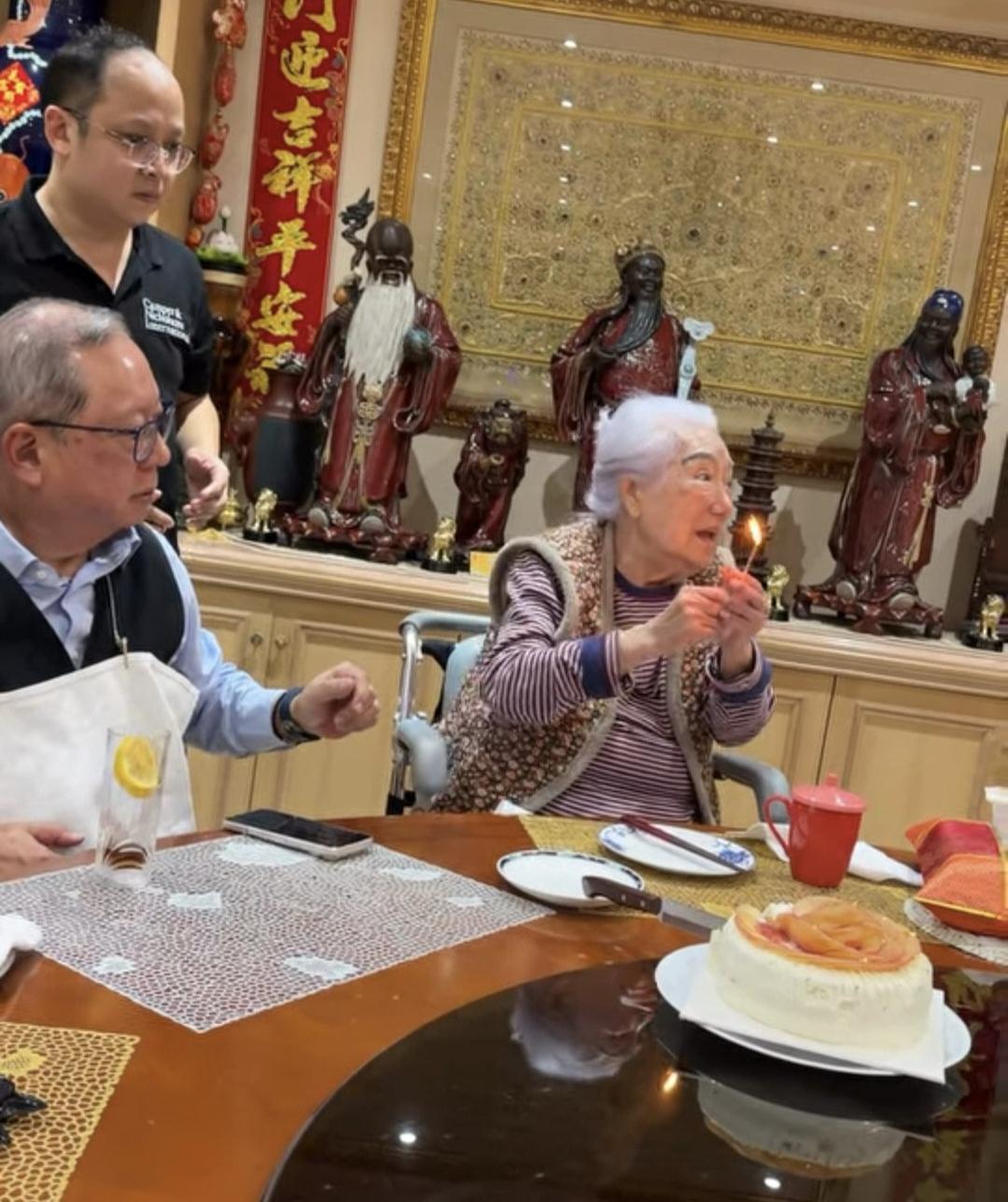 101岁余宝珠和儿子林建岳、孙子林孝贤一起庆祝生日,老太太已经满头白发了,但精神状态挺好的,一些表情和动作像小孩子,看起来非常亲切和蔼! 余宝珠是香港富商林百欣的妻子,在香港富人圈里德高望重。当年儿子林建岳和儿媳谢玲玲闹离婚时,她大义灭亲,站在谢玲玲一边,为谢玲玲分割到了更多财产,赢得一片叫好声! 这次余宝珠生日,谢玲玲也有在场,但是没有露脸!