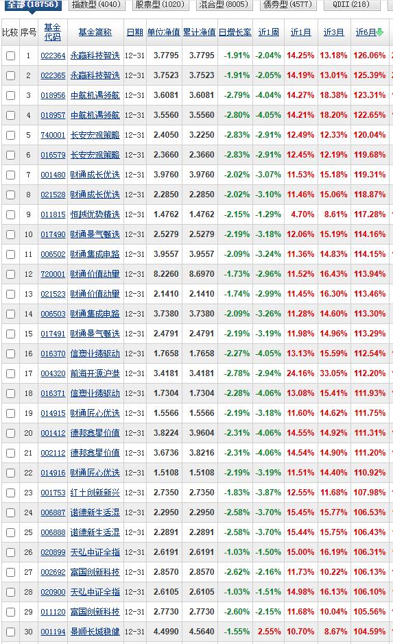 2026年第一天,虽然今天不开盘,但每周固定节目收益榜还是要公布的。 公布之前,祝愿大家在2026年里财源广进,多赚钞票,身体健康,万事如意! 永赢科技智选毫无疑问强势拿下年度收益榜第一,中航机遇领航第二,同泰产业升级第三,红土创新新兴第四,恒越优势精选第五,信澳业绩驱动第六,中欧数字经济第七,交银优择回报第八,汇安成长优选第九,华商均衡成长第十。 半年榜前十是:永赢科技智选,中航机遇领航,长安宏观策略,财通成长优选,恒越优势精选,财通景气甄选,财通集成电路,财通价值动量,信澳业绩驱动,前海开源沪港深乐享生活。前十里面财通基金占据了四只。