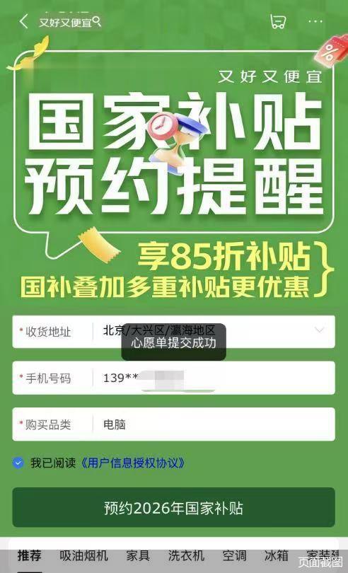 北京商报记者从京东方面了解到,1月1日零点“国补”在京东上线后,北京“国补”资格当即秒空,很多一早蹲守预约的消费者也没有抢到国补资格,只能在“国家补贴预约提醒”页面提交“心愿清单”。有消费者留言希望增加名额,以便更顺畅以旧换新。