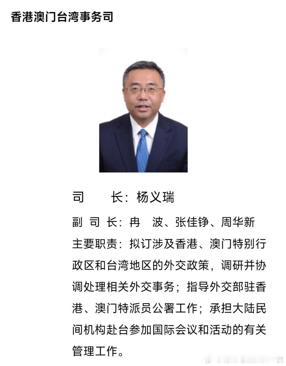 外交部港澳台司司长杨义瑞,出任中国驻葡萄牙大使。