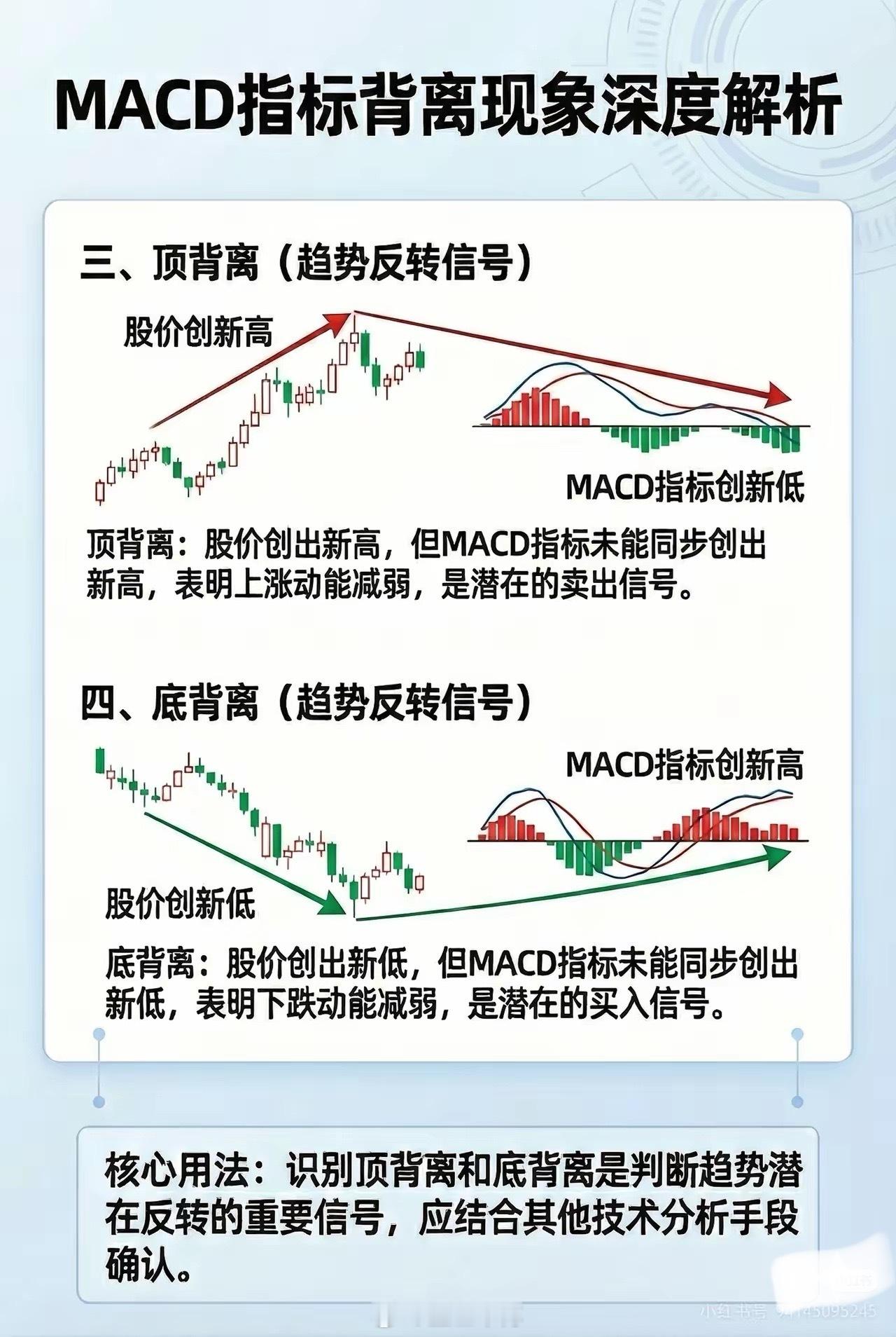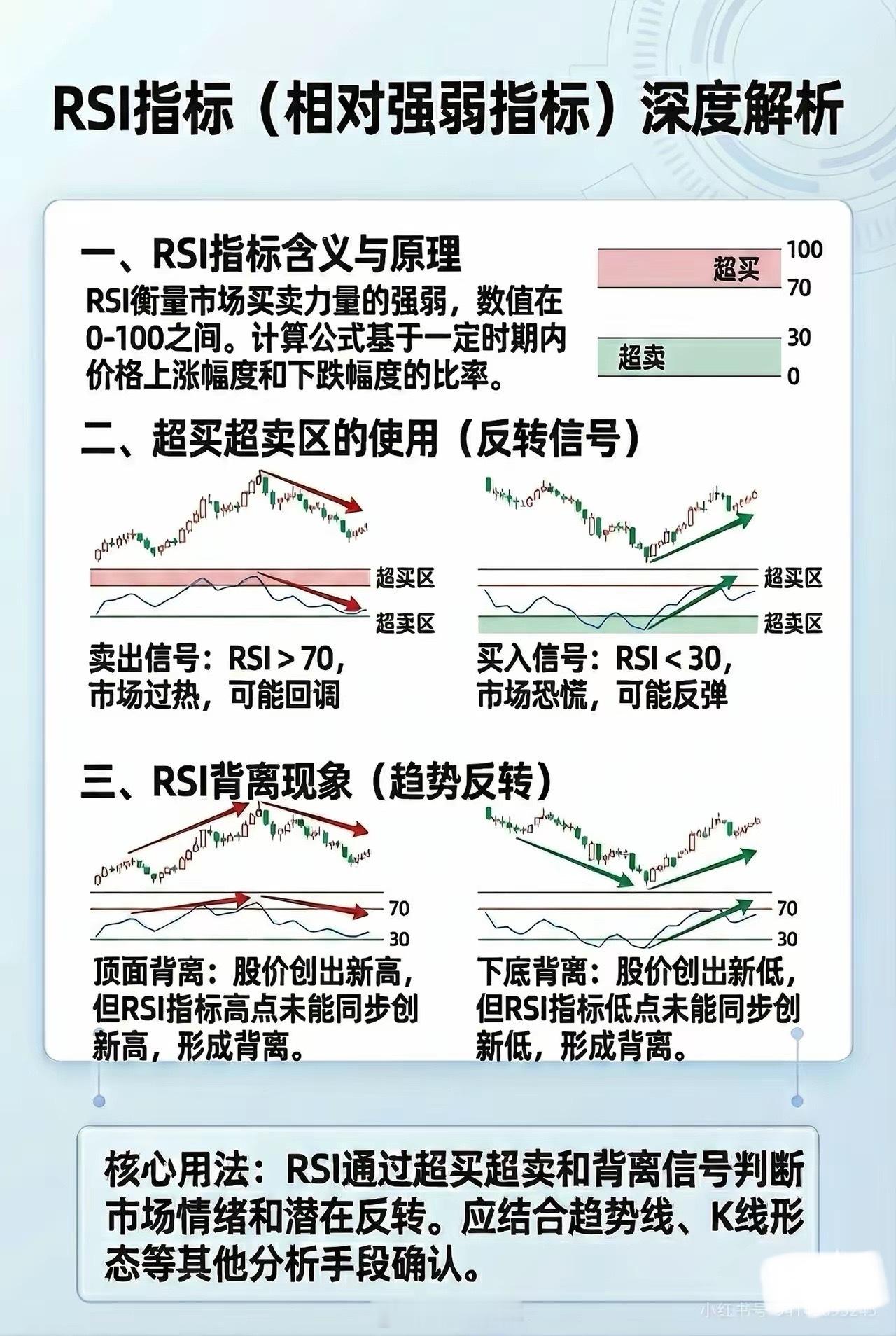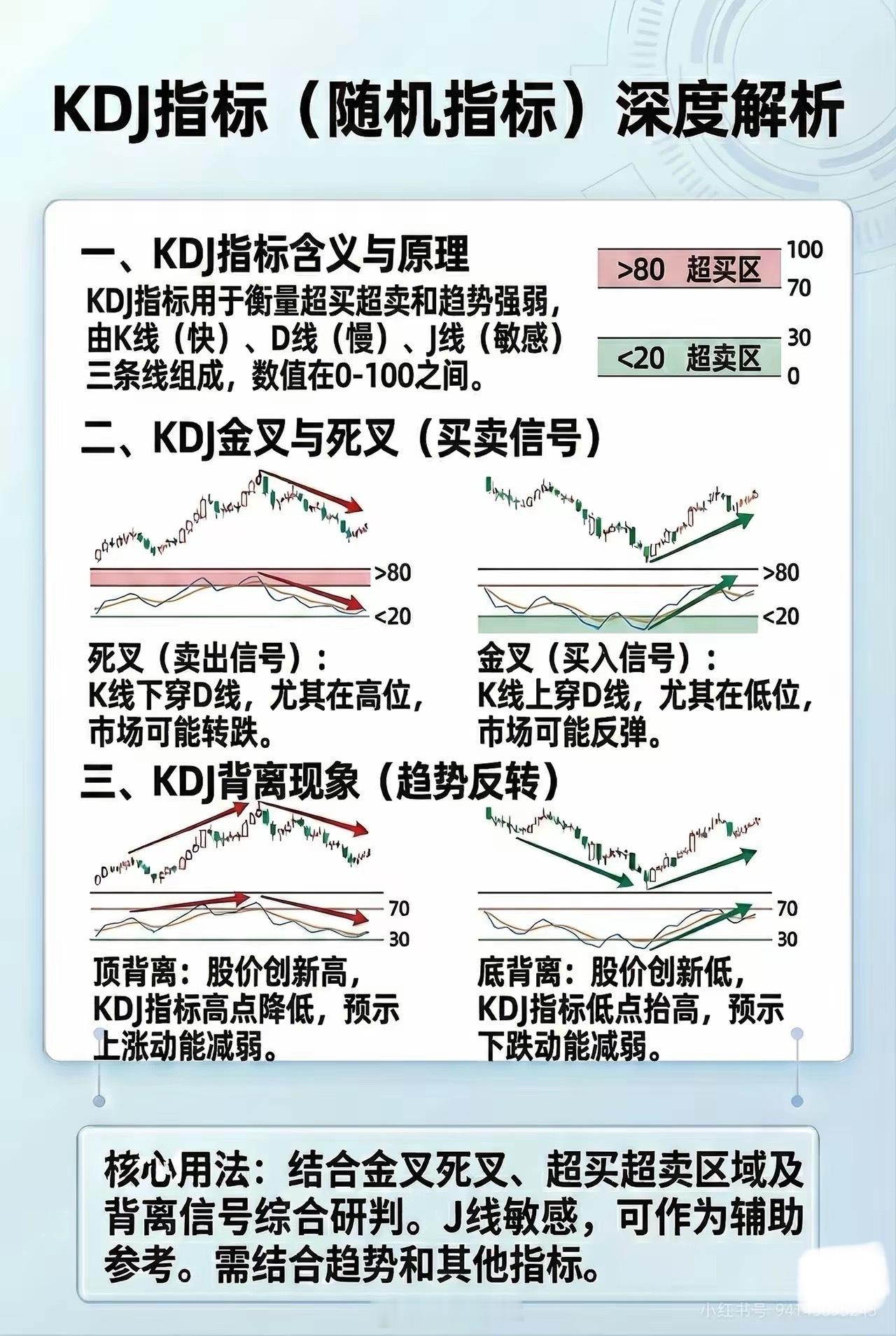 MACD、RSI、KDJ、均线是什么,怎么使用1、 MACD (指数平滑异同移动平均线)MACD被称为“指标之王”,它不仅看趋势,更看趋势的变化速度。通过快线(DIF)与慢线(DEA)的距离,衡量中短期趋势相对于长期趋势的乖离程度与演变动能。实战含义: 柱状图(Bar): 衡量多空双方力量的爆发力。红柱增长代表多头动能增强。背离: 当价格创新高但MACD不创新高,衡量的是趋势虽然还在,但“气力”已经衰竭。2、RSI (相对强弱指标)RSI是一个纯粹的相对力量指标,它不看绝对价格,只看涨跌比例。衡量在一段时间内,上涨的幅度总和相对于总波动幅度的占比。实战含义:超买/超卖(0-100):当RSI超过70,显示超买,小于30显示超卖。强弱分界: 50常作为牛熊分界线。3、KDJ (随机指标)KDJ是最敏感的指标,衡量超买超卖和趋势强弱。实战含义:衡量股价是否已经偏离了短期内的正常波动范围(RSV值)。金叉/死叉: 在超买或超卖区出现的交叉,通常预示着短期趋势的剧烈反转。4、均线 (MA / EMA)均线是最基础的指标,它的核心逻辑是惯性。衡量在特定时间内,市场参与者的平均持仓成本。实战含义: 当股价在均线之上,说明近期买入的人多处于盈利状态,趋势向好。均线具有“助涨助跌”的特性,本质上是市场共识的心理支撑位或压力位。