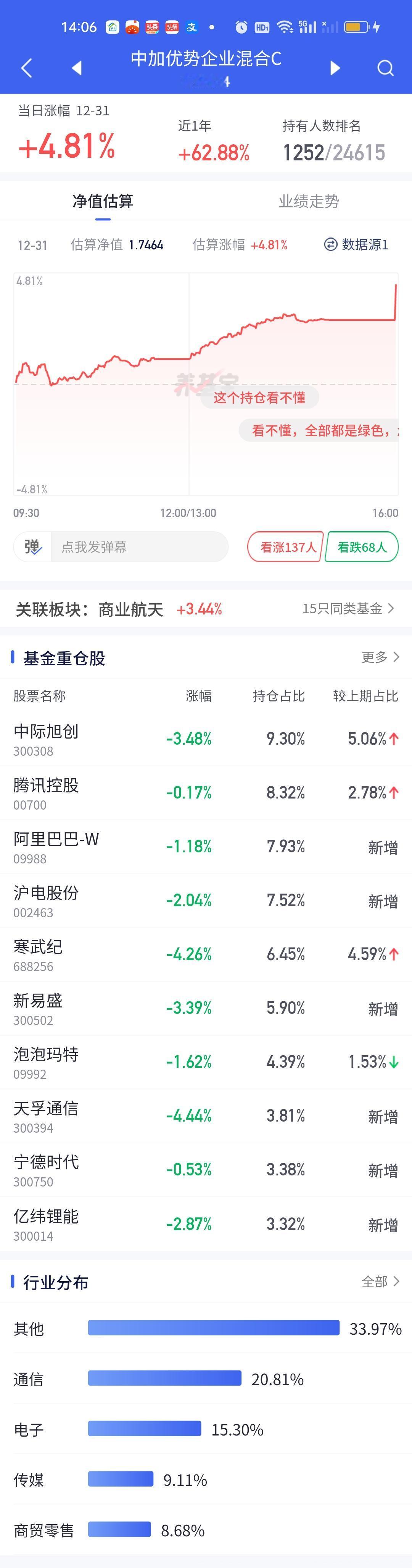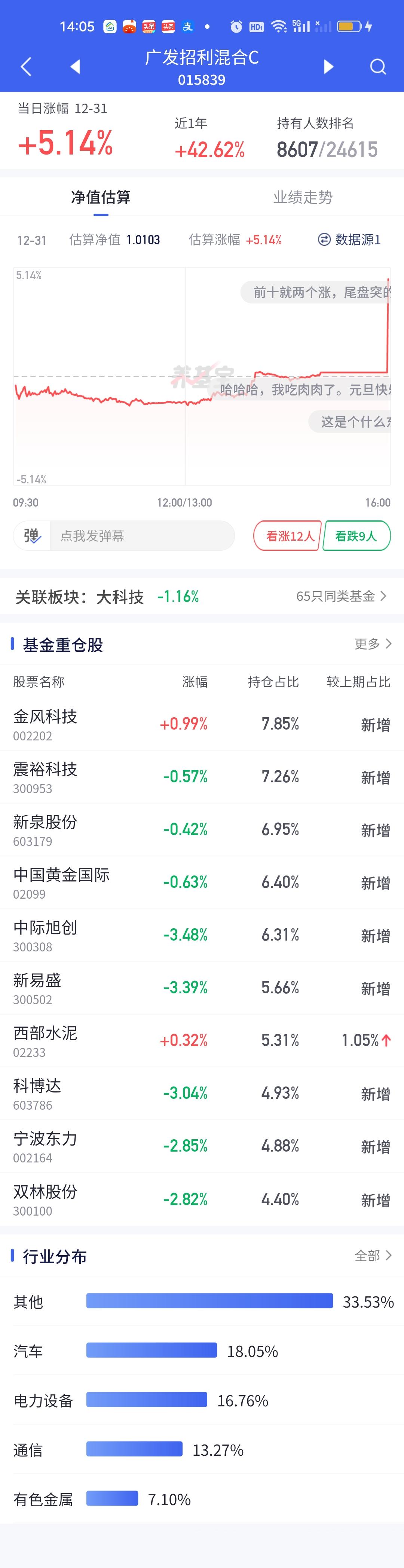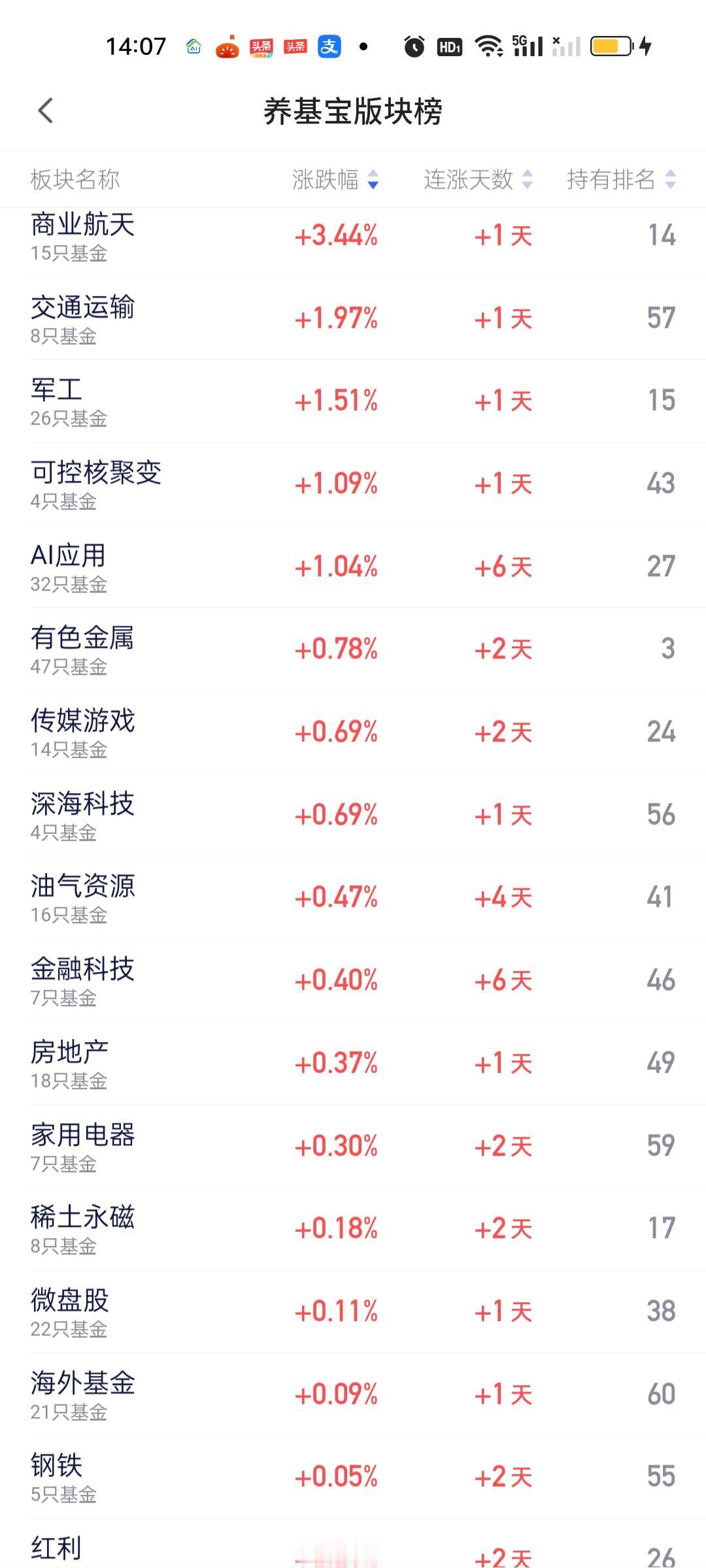 商业航天目前显示只有15只基金,但很显然又有许多基金偷偷转换到了这个板块。目前应该是不低于50只的。大家可以观察一下细节啊,昨天涨的最好的是不是商业航天板块?而其它板块最多就涨1个点不到,最后公布的净值有许多基金净值是超级高开的,看持仓能开红就不错了,开出来清一色涨4点多,5点多。 这就说明百分百调仓换股了,而且昨天涨得最好的就是商业航天,具备唯一性,那就可以大胆猜测这些基金已经调仓到商业航天了,至于是玩短线还是长期拿那就不得而知了,因为它们的基金规模都挺小的!