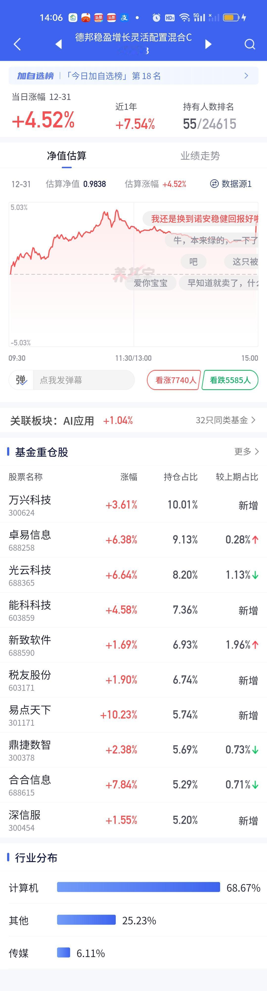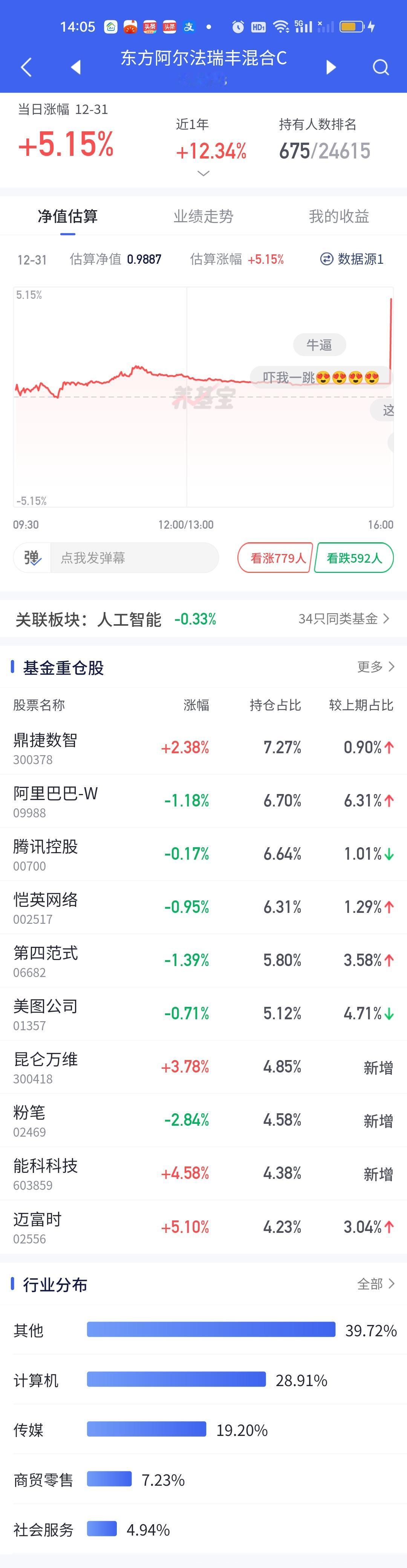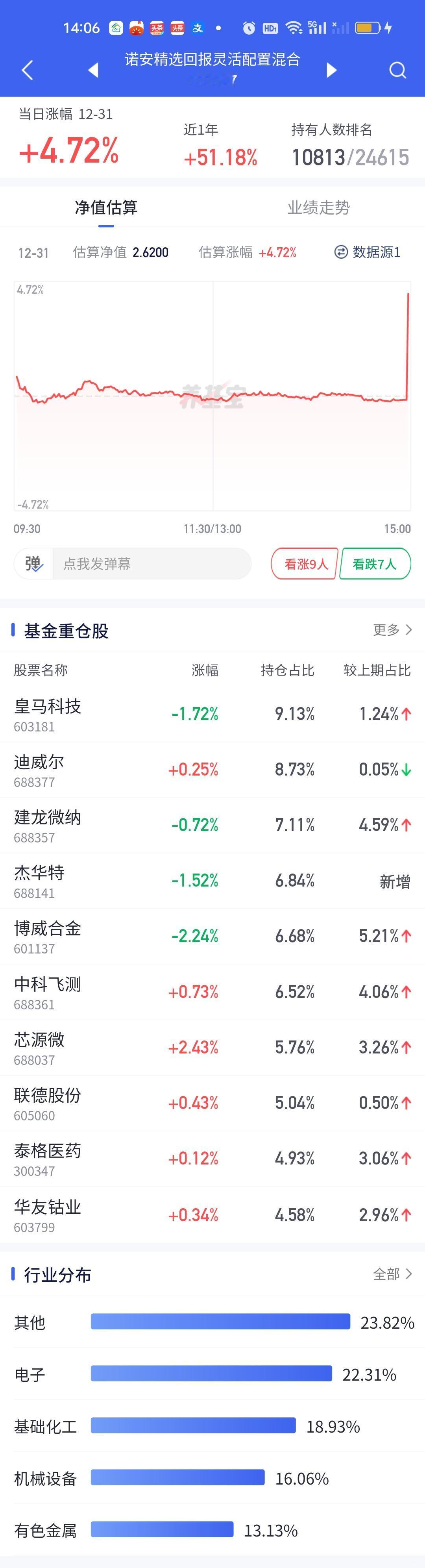 商业航天目前显示只有15只基金,但很显然又有许多基金偷偷转换到了这个板块。目前应该是不低于50只的。大家可以观察一下细节啊,昨天涨的最好的是不是商业航天板块?而其它板块最多就涨1个点不到,最后公布的净值有许多基金净值是超级高开的,看持仓能开红就不错了,开出来清一色涨4点多,5点多。 这就说明百分百调仓换股了,而且昨天涨得最好的就是商业航天,具备唯一性,那就可以大胆猜测这些基金已经调仓到商业航天了,至于是玩短线还是长期拿那就不得而知了,因为它们的基金规模都挺小的!