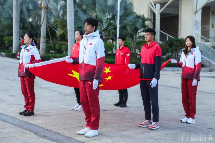 2026年第一天,国家游泳集训队在海南白沙基地,迎着新年朝阳参加庄严的升旗仪式。
