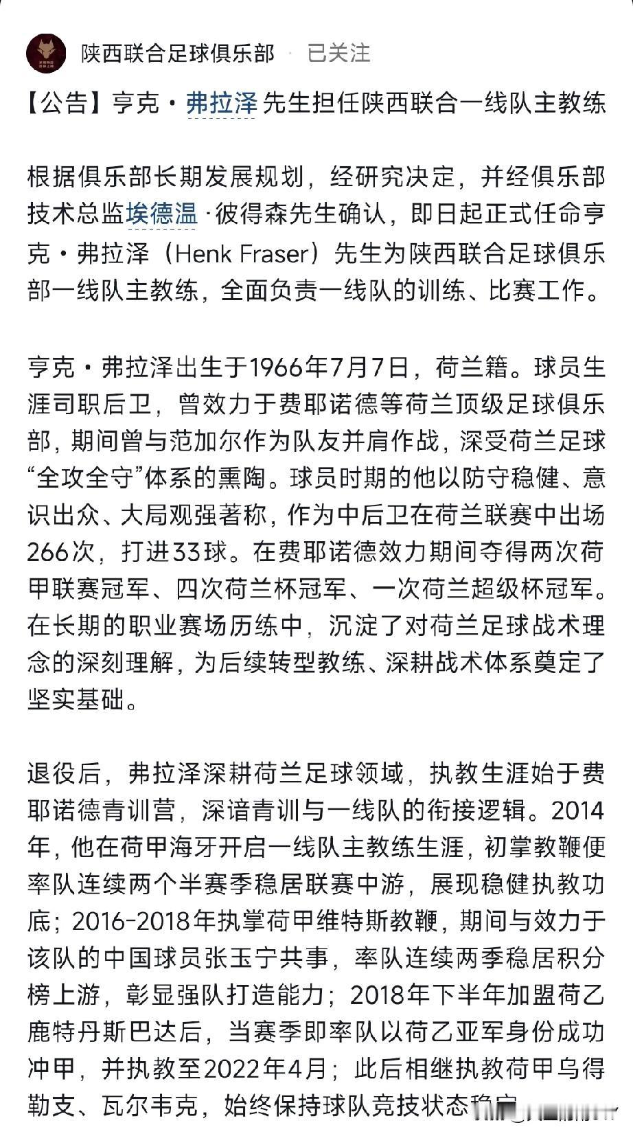 新年伊始,陕西联合俱乐部便在元旦上午正式官宣了主教练的到位。 新任主教练是荷兰籍的亨克·弗拉泽,他履历丰富,曾担任多支荷甲球队的主教练。在荷甲球队维特斯执教期间,他大胆启用了中国籍球员张玉宁。 他还曾是荷兰国家队教练组成员、苏里南国家队助理教练,在职业联赛和国家队都有着丰富的执教经验。经俱乐部技术总监埃德温确认,看来俱乐部依旧坚持自己的荷兰风格。希望陕西联合俱乐部能在新主教练的带领下,继续在中甲联赛披荆斩棘,笑傲绿茵场。陕西队西北狼🐺加油!