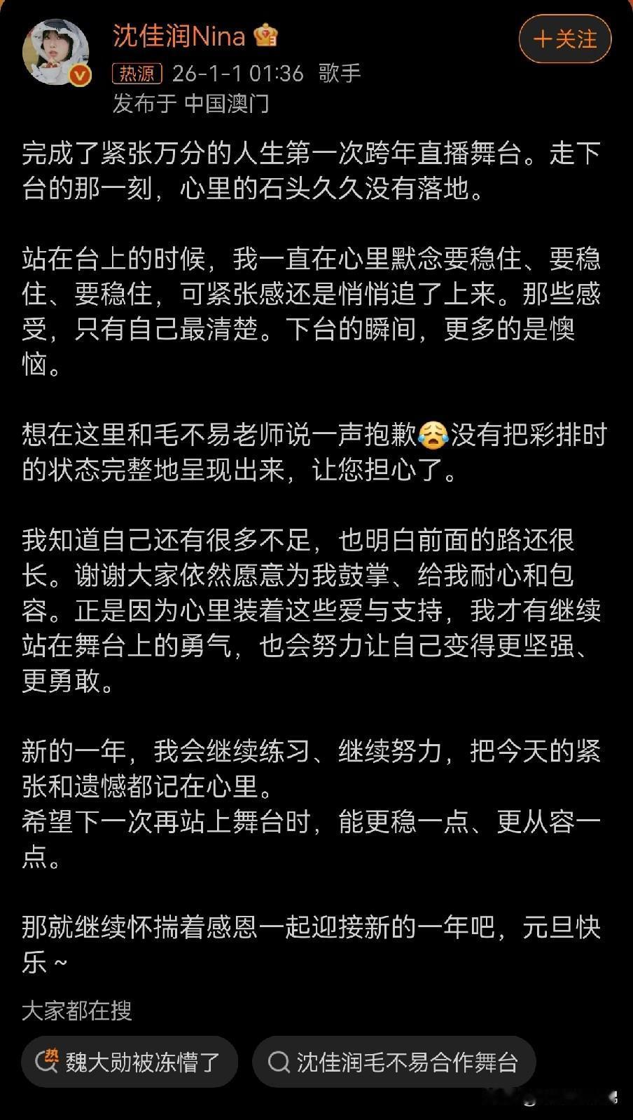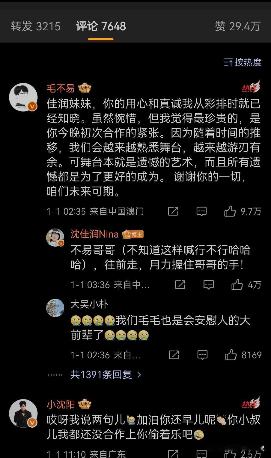 沈佳润向毛不易道歉喊“哥哥”,小沈阳评论“你小叔儿我都还没合作过,你就偷着乐吧!”这父女俩各喊各的,差着辈分呢,着实好笑! 不过毛不易超高情商回应瞬间吸粉无数:“你的真诚和用心,从彩排时就已知晓,虽然惋惜,但最珍贵,舞台本就是遗憾的艺术!”。 这番引导和宽慰给足沈佳润面子,作为过来人,自己淋过雨也要给别人撑把伞!在舞台上发现沈佳润紧张,出现抢拍和跑调之后,毛不易便在一旁边鼓励和打拍,帮她找节奏。现在沈佳润道歉,他言语之中没有一句埋怨指责,全是宽容和鼓励!足以见得毛不易人品确实很好! 他是从草根出来的歌手,深知从台后走到台前的不易,虽然沈佳润有爸爸小沈阳力捧,比毛不易当初出道容易多了,但沈佳润的努力大家都看在眼里,她可能还需要更多舞台历练,假以时日,不可小觑。这也许就是人与人之间的惺惺相惜吧!