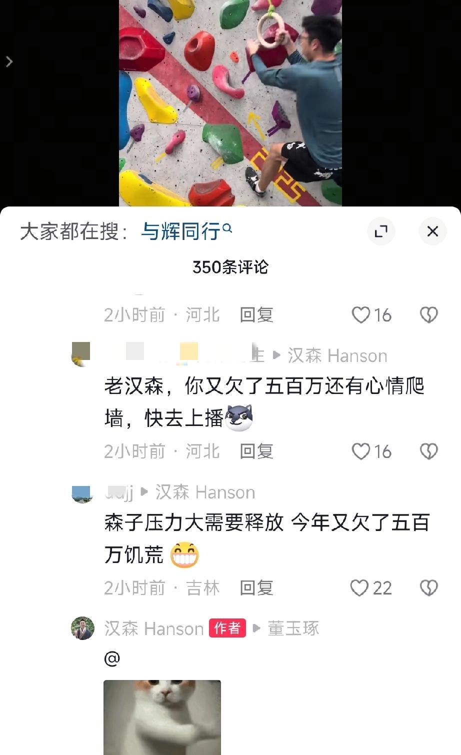 谁能想到?汉森好不容易休息一天,居然又去攀岩了,在西安。连盼盼都说“真牛,走到哪攀到哪。” 网友的评论就更有趣了,有说汉森又欠了500万,怎么还有心情去爬墙,有说汉森因为又欠了500万饥荒,需要去爬墙释放。 汉森和董董的互动就更搞笑了,相互甩起了表情包。 昨天晚上汉森的钢琴演奏真的是太精彩了,最精彩的还有他一会前面一会后面的来回跑动和反应速度。经过两天的紧张排练加上昨晚的精彩演出,他们今天也确实需要好好的放松放松了! 每个人都有每个人的爱好和释放压力的方式,而这些一般是不容易被改变的。除了工作、弹琴,汉森最喜欢的可能就是攀岩了! 董宇辉 与辉同行 兰知春序